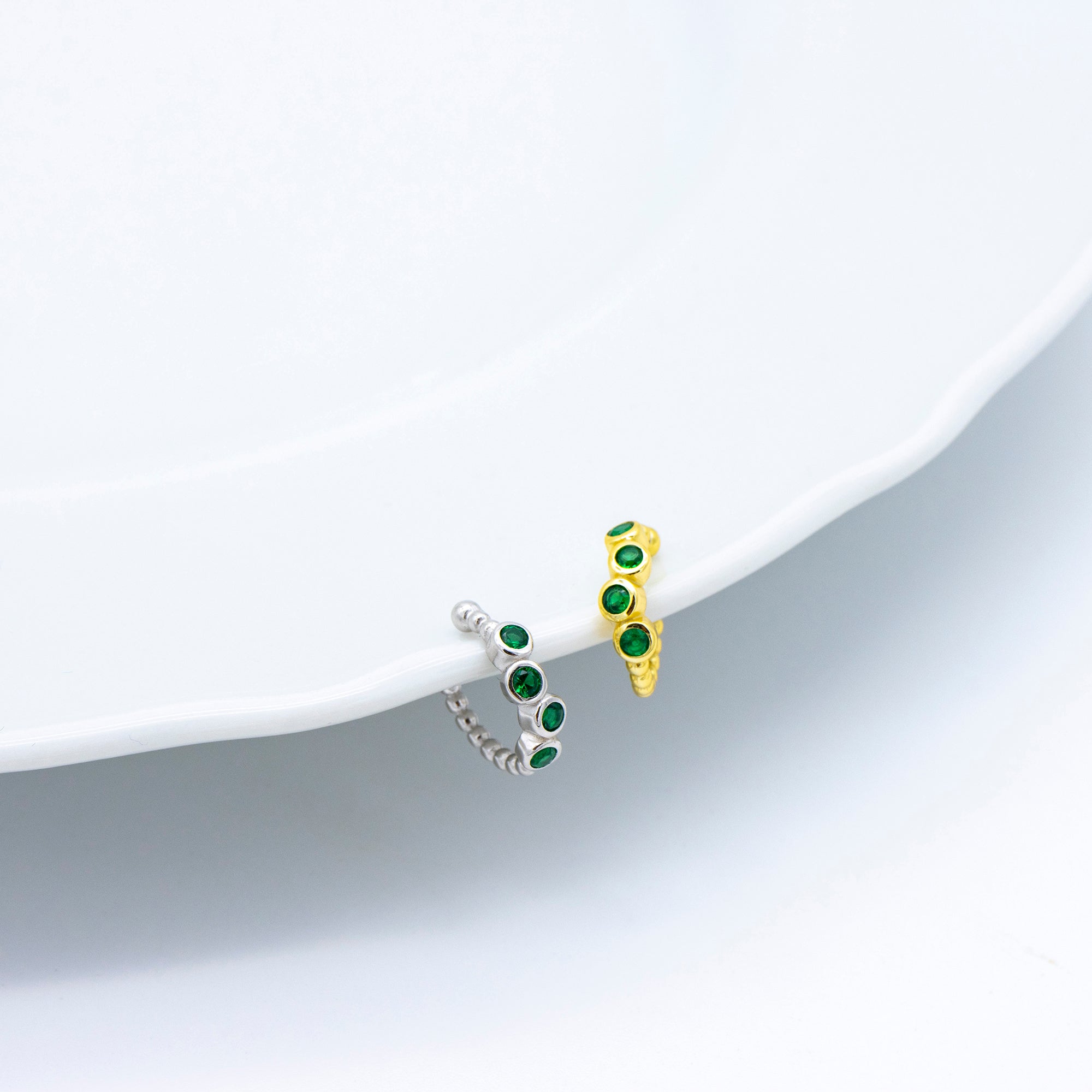 Die goldene Ohrklemme aus 925er Sterlingsilber ist mit 4 strahlenden, grünen Zirkonia Steinen besetzt. Durch die einzigartige Kugelstruktur erhält der Ohrring ein elegantes und funkelndes Finish. Diese luxuriöse, kugelförmige Silhouette macht den Ohrring zu einem stilvollen Accessoire.