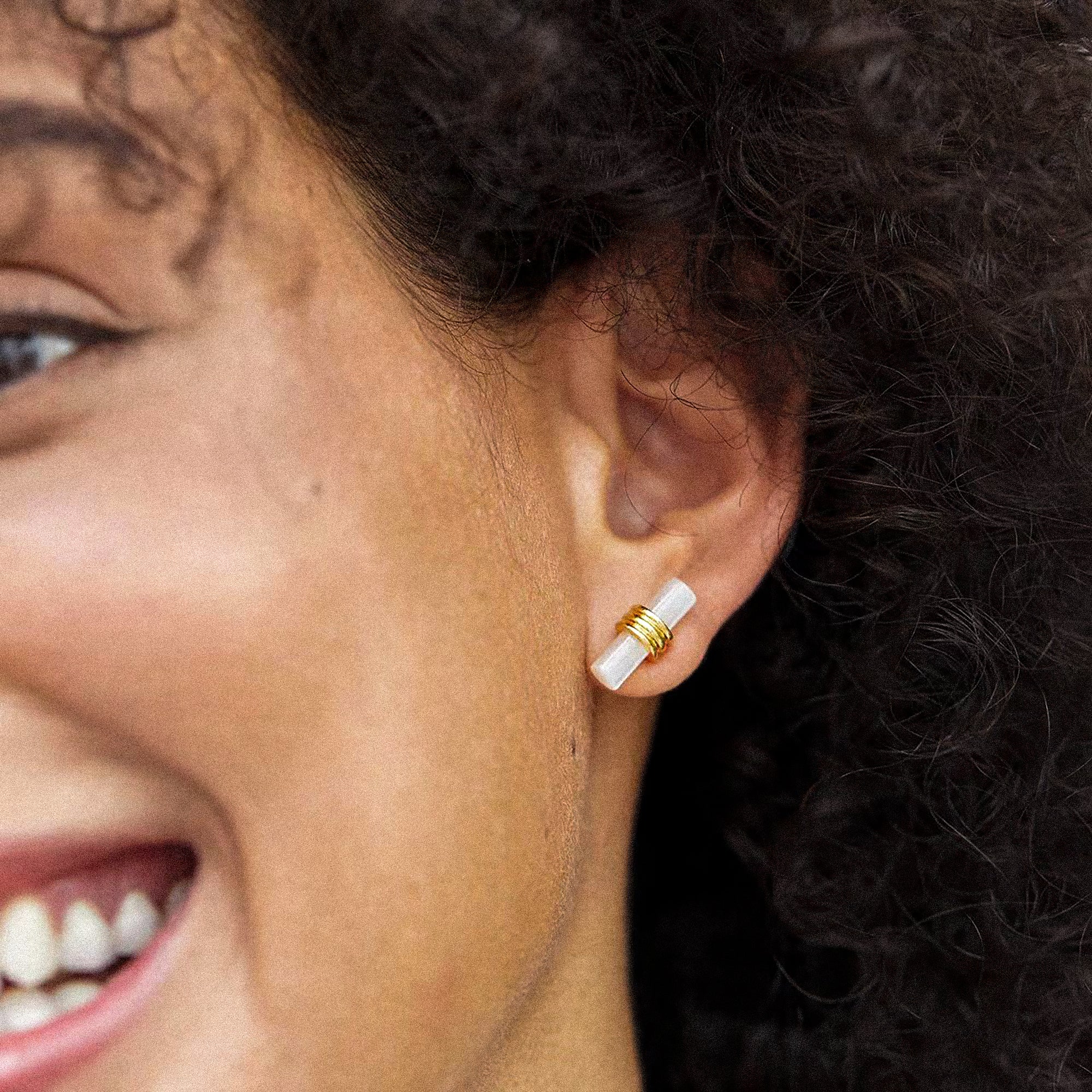 Diese Ohrstecker sind voller Eleganz und perfekt, um Ihre femininen Looks zu unterstreichen. Mit dezenter Kombination aus farbigem Achat oder schimmerndem Perlmutt in Zylinderform sowie einem goldenen Ring, verleihen sie Ihrem Look einen glamourösen aber trotzdem lässigen Touch!