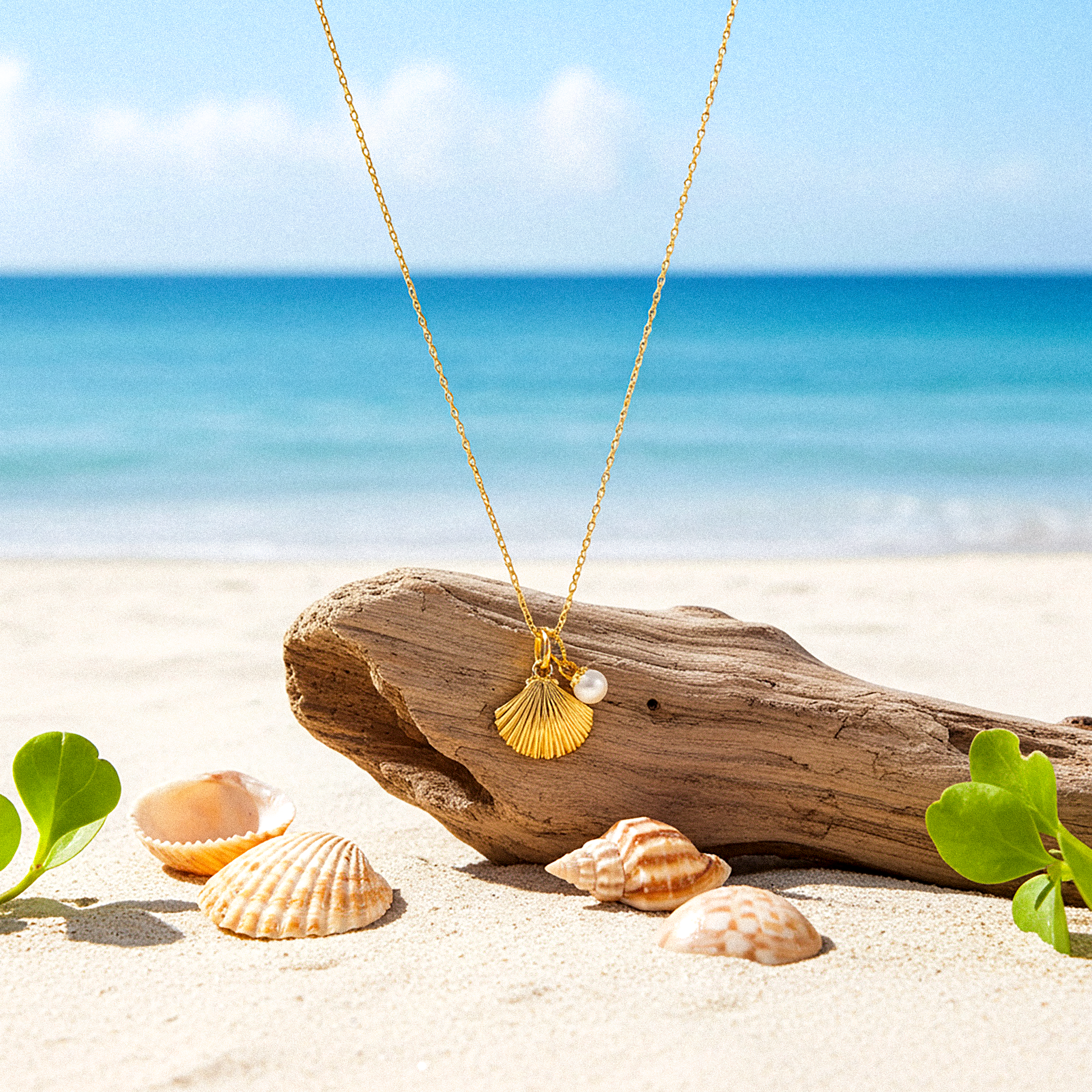 Lass dich von der Muschelkette in eine Welt voller Sommer, Sonne und Meeresrauschen entführen. Die Muschel und Perle Anhänger bringen Erinnerungen an warme Tage und salzige Luft direkt an dein Dekolleté.
