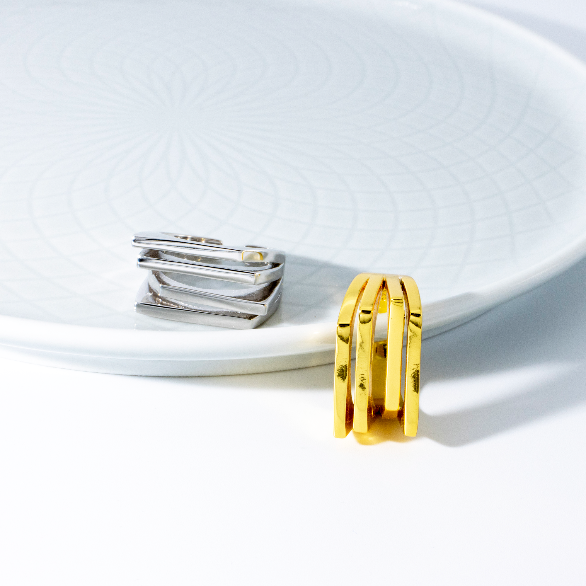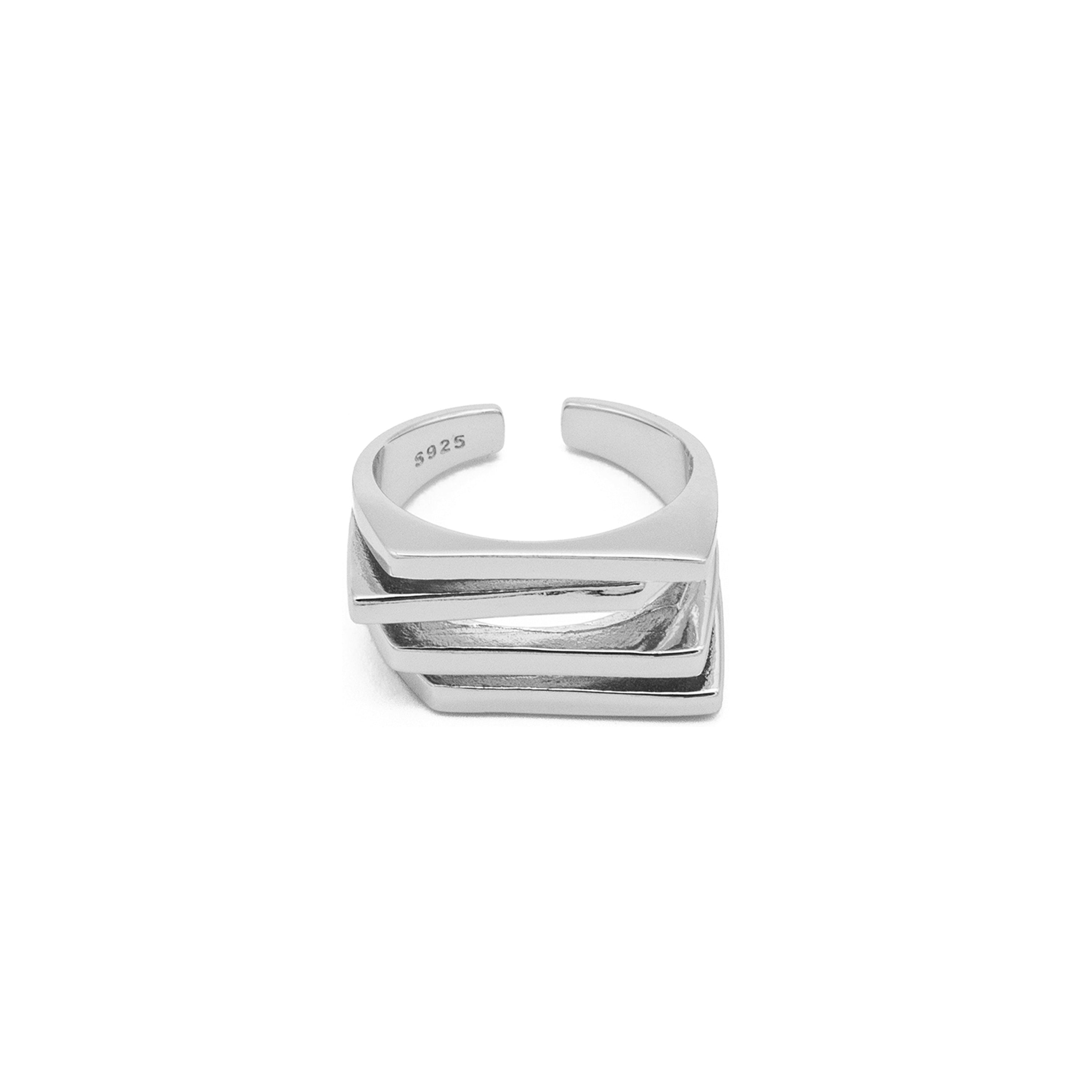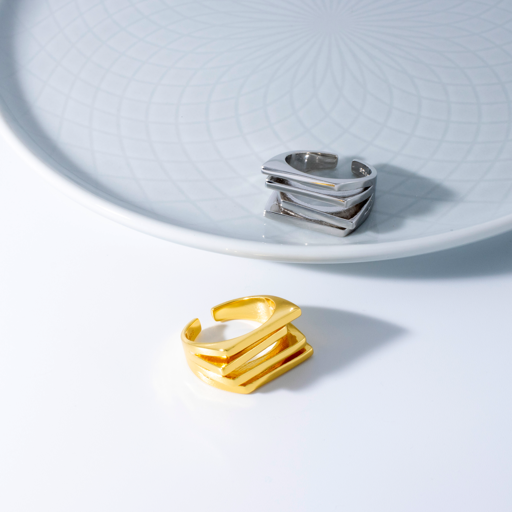 Entdecke den luxuriösen Damenring. Er besitzt mehrlagige Ringschienen und hat skulpturartiges Design. Seine puristische Formensprache und seine eckige Form verleihen dem Ring eine stilsichere, auffällige Optik. Seine besondere Vielfalt an geometrischen Details sorgt für ein cooles, neutrales Gefühl. Perfekt für alle, die einen eleganten und exklusiven Look bevorzugen.