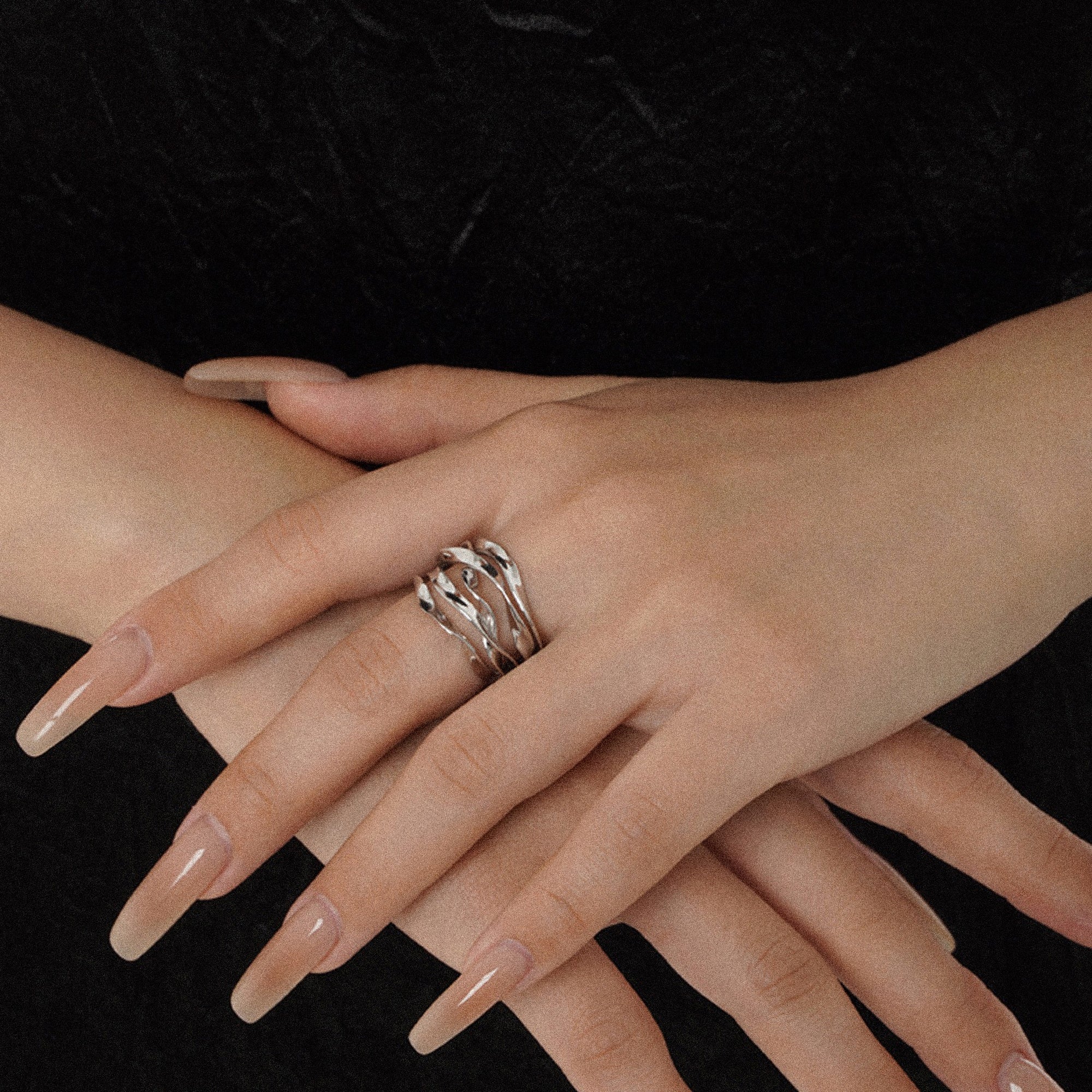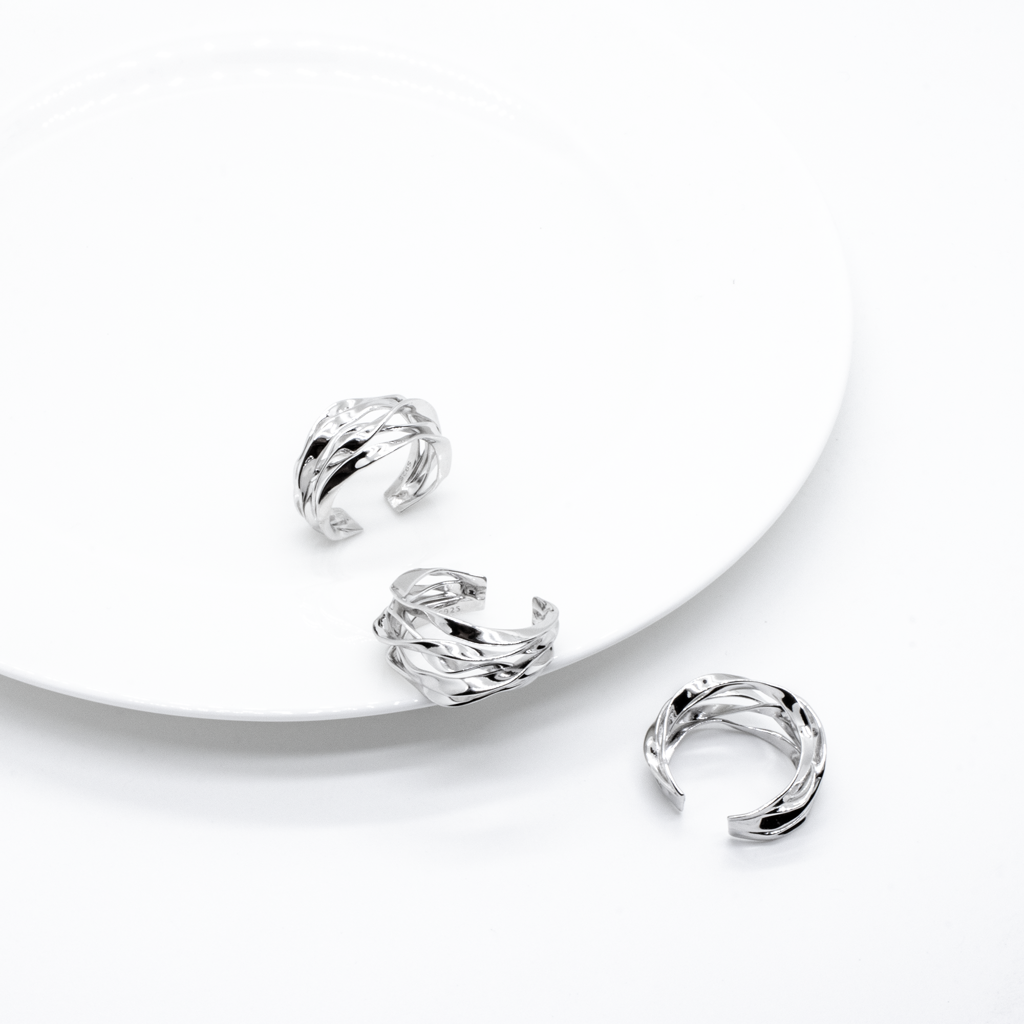 Dieser Ring zeichnet sich durch sein modernes und skulpturales Design aus. Er besteht aus mehreren übereinanderliegenden, zarten Bändern, die ein offenes, geflochtenes Muster bilden. Die organischen Formen und die leichte, luftige Struktur verleihen dem Ring eine besondere Leichtigkeit und Eleganz. Der Ring ist 13,5 mm breit und aus reinem 925 Silber gefertigt.