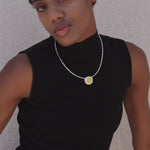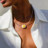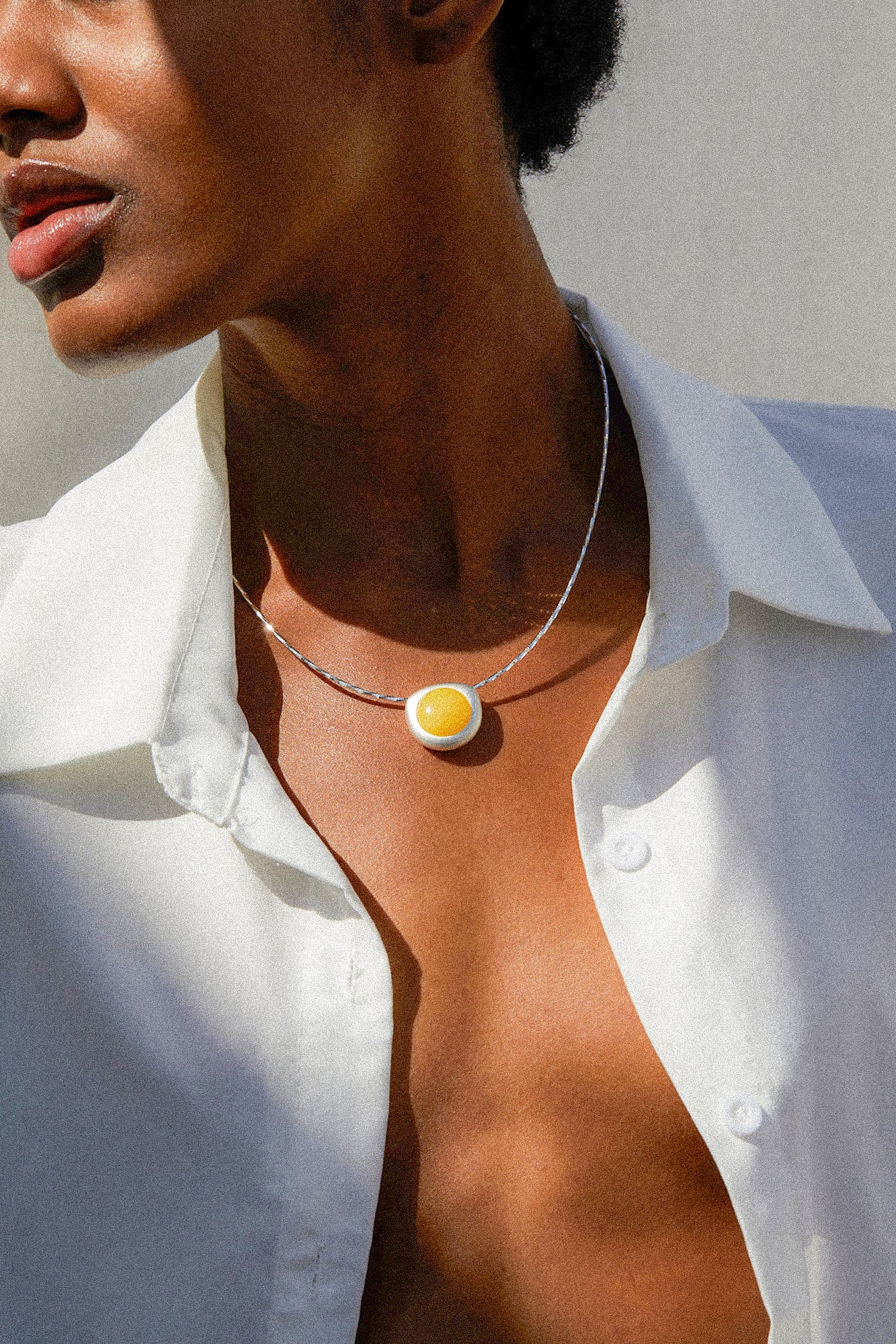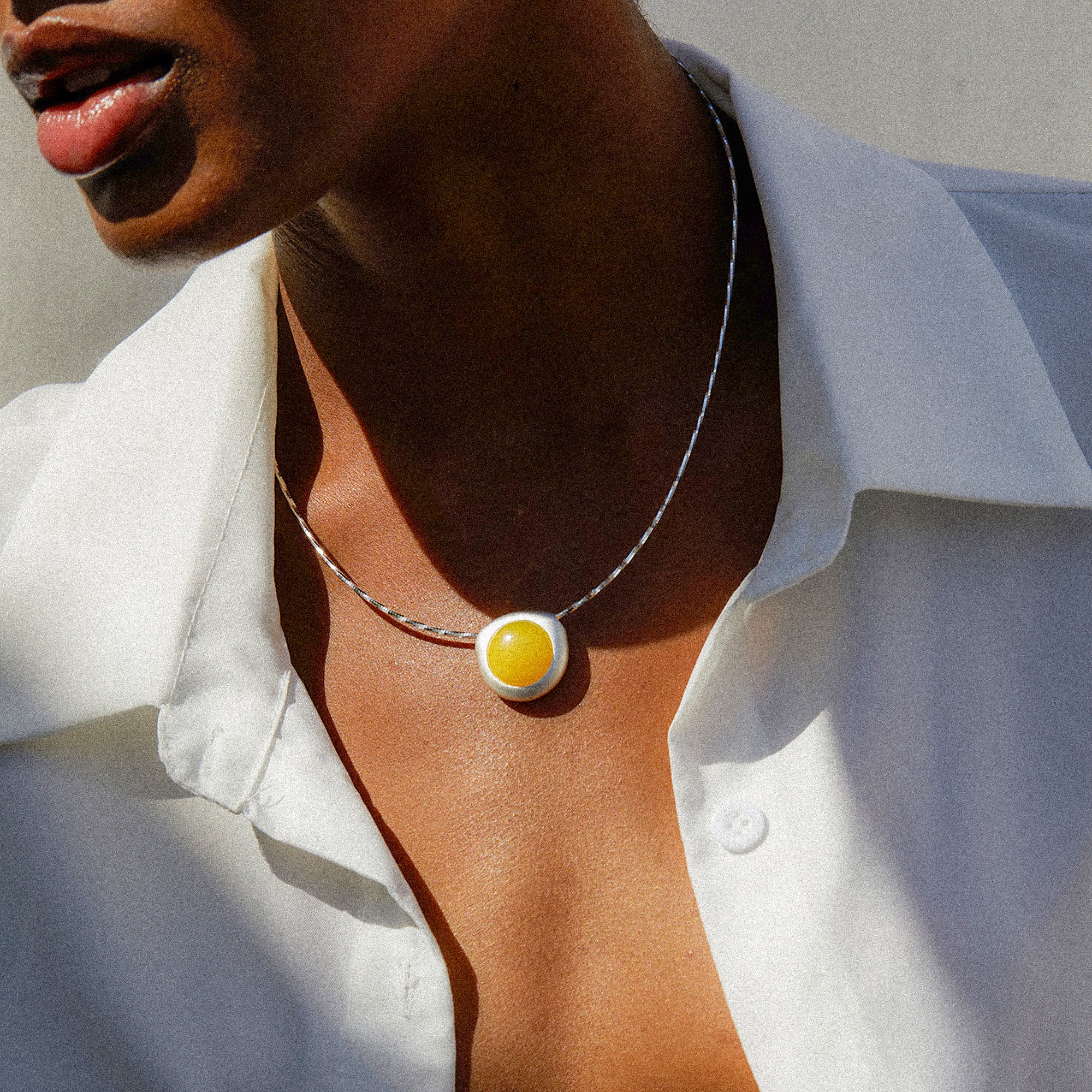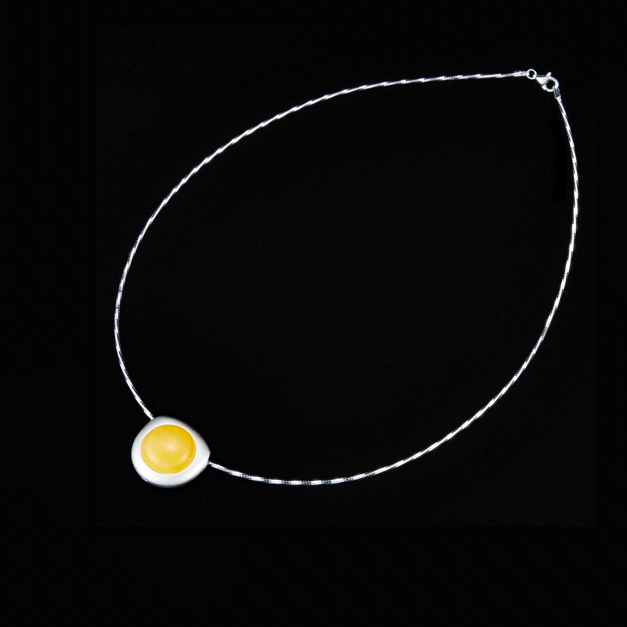 Dieser edle Halsreif setzt stilvolle Frauen perfekt in Szene. Der prächtige Bernstein-Anhänger verleiht dem Design eine besondere Note. Ein wahres Kunstwerk, das jedem Outfit luxuriösen Glanz verleiht. Tauchen Sie ein in die Welt der Eleganz und lassen Sie sich von diesem Halsreif verzaubern.