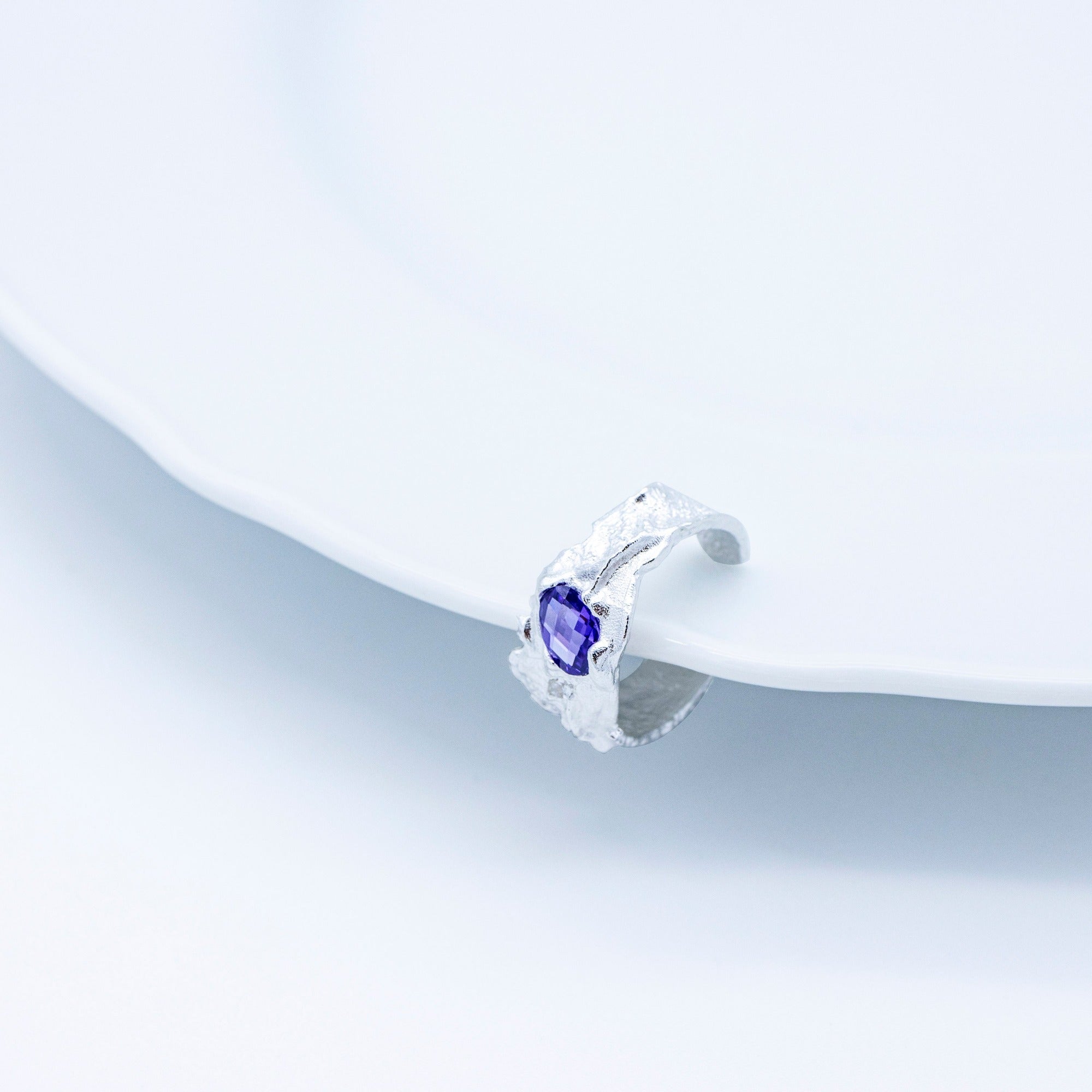 The ladies' ring impresses with its rough textured ring structure made of 925 sterling silver. The violet stone sits in the middle and creates a shiny contrast to the modern structural design. This ring is the perfect companion for an elegant and glamorous look.