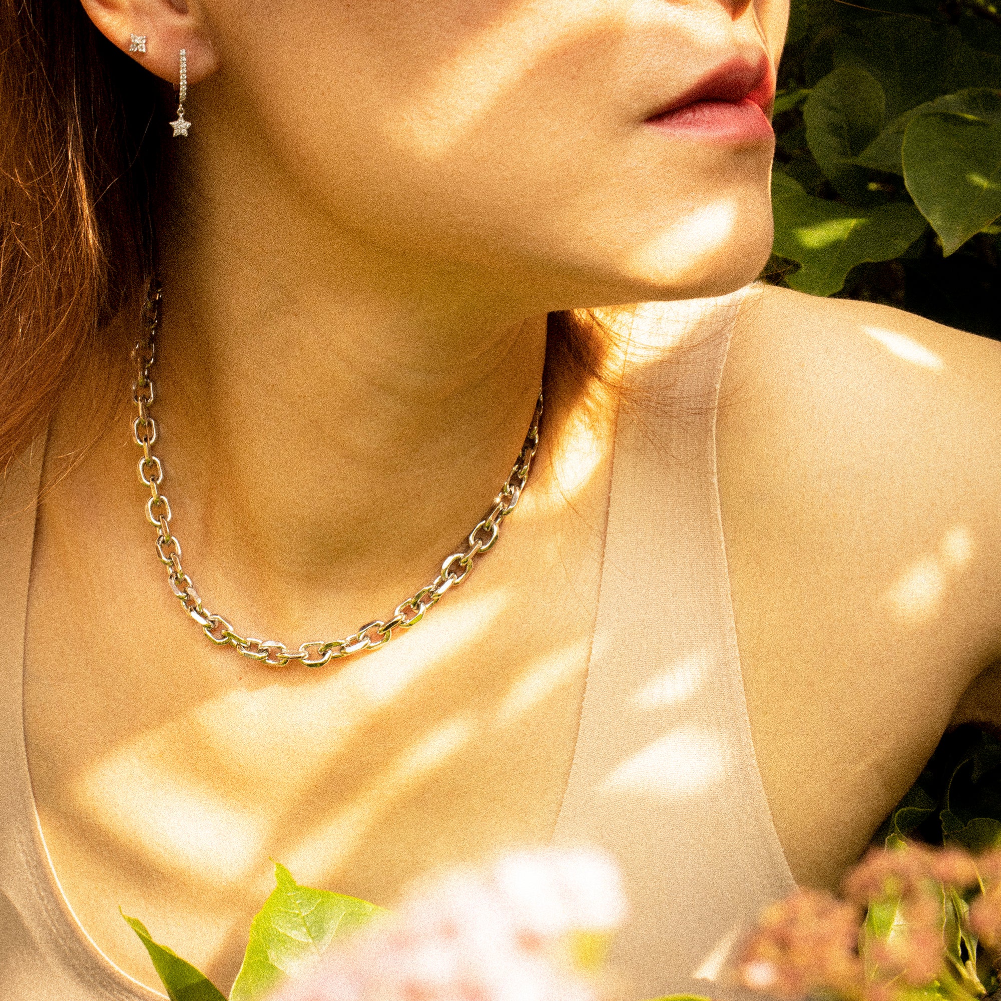 This stylish necklace and bracelet are made of finely cut and polished shiny chips. Each side of the jewelry is unique and reflects the light to create a sparkling appearance. Wear it as a single piece or layer it with others for a modern look. Absolutely it-piece!