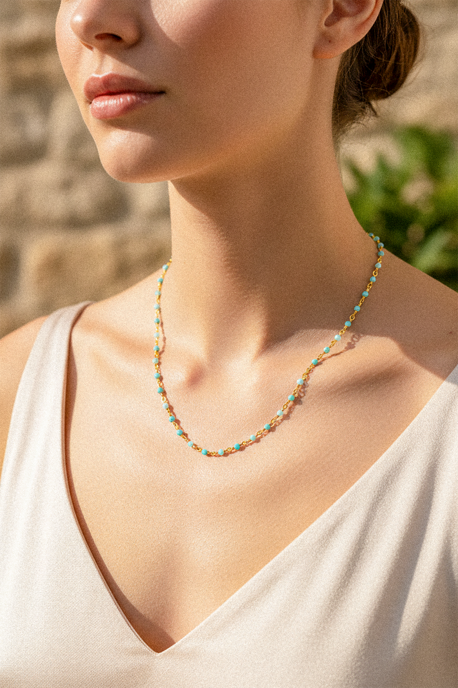 The delicate amazonite adds a feminine touch and harmonizes beautifully with other gold necklaces in a layered look. Whether for everyday wear or special occasions – this necklace lends your outfit an elegant, modern flair.
