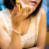 This stylish necklace and bracelet are made of finely cut and polished shiny chips. Each side of the jewelry is unique and reflects the light to create a sparkling appearance. Wear it as a single piece or layer it with others for a modern look. Absolutely it-piece!