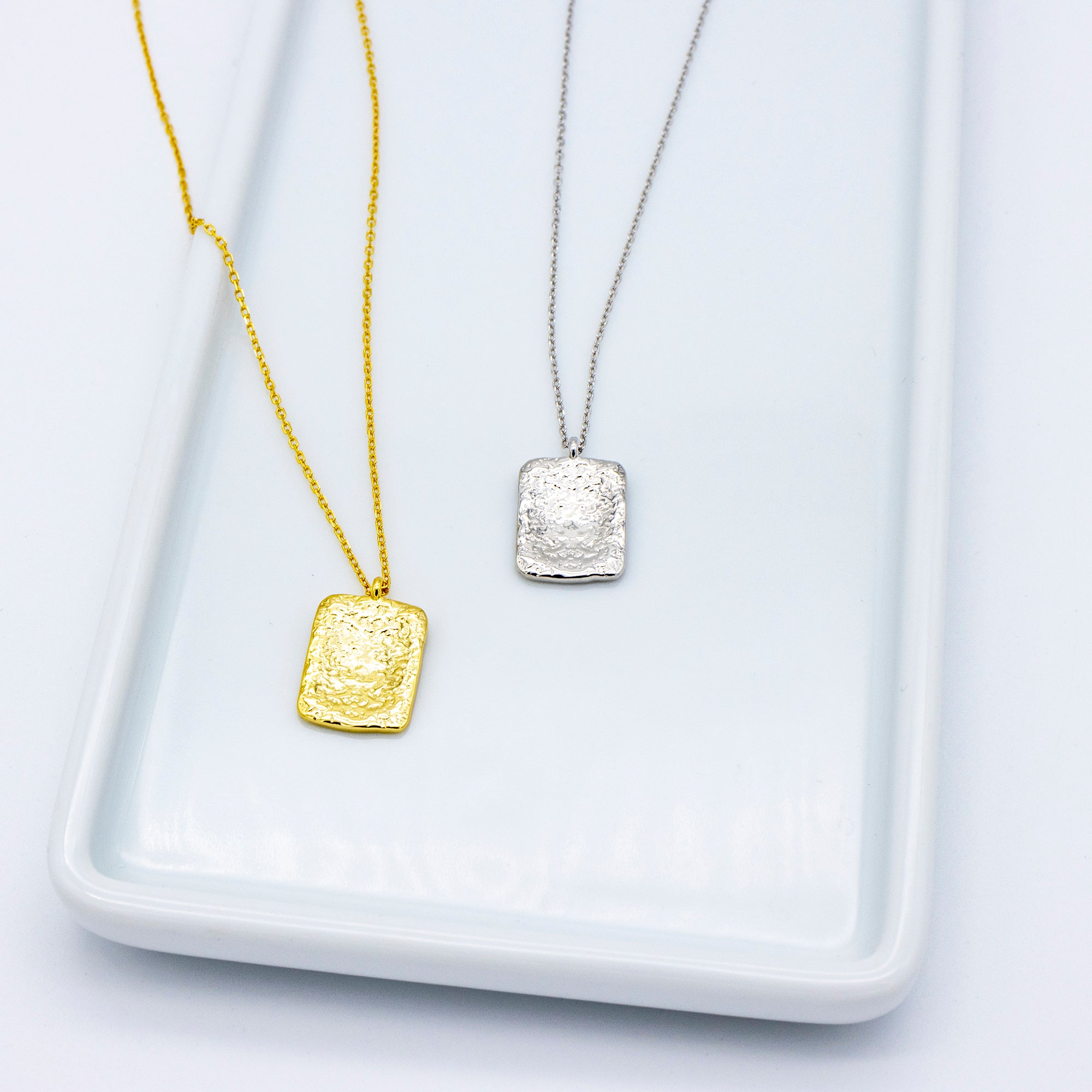 This gold tag necklace is a casual creation that offers the perfect balance between modern chic and playful elegance. The tag pendant is styled with richly textured finishes to enhance the design, creating a fantastic accessory that will enhance both work and casual looks.