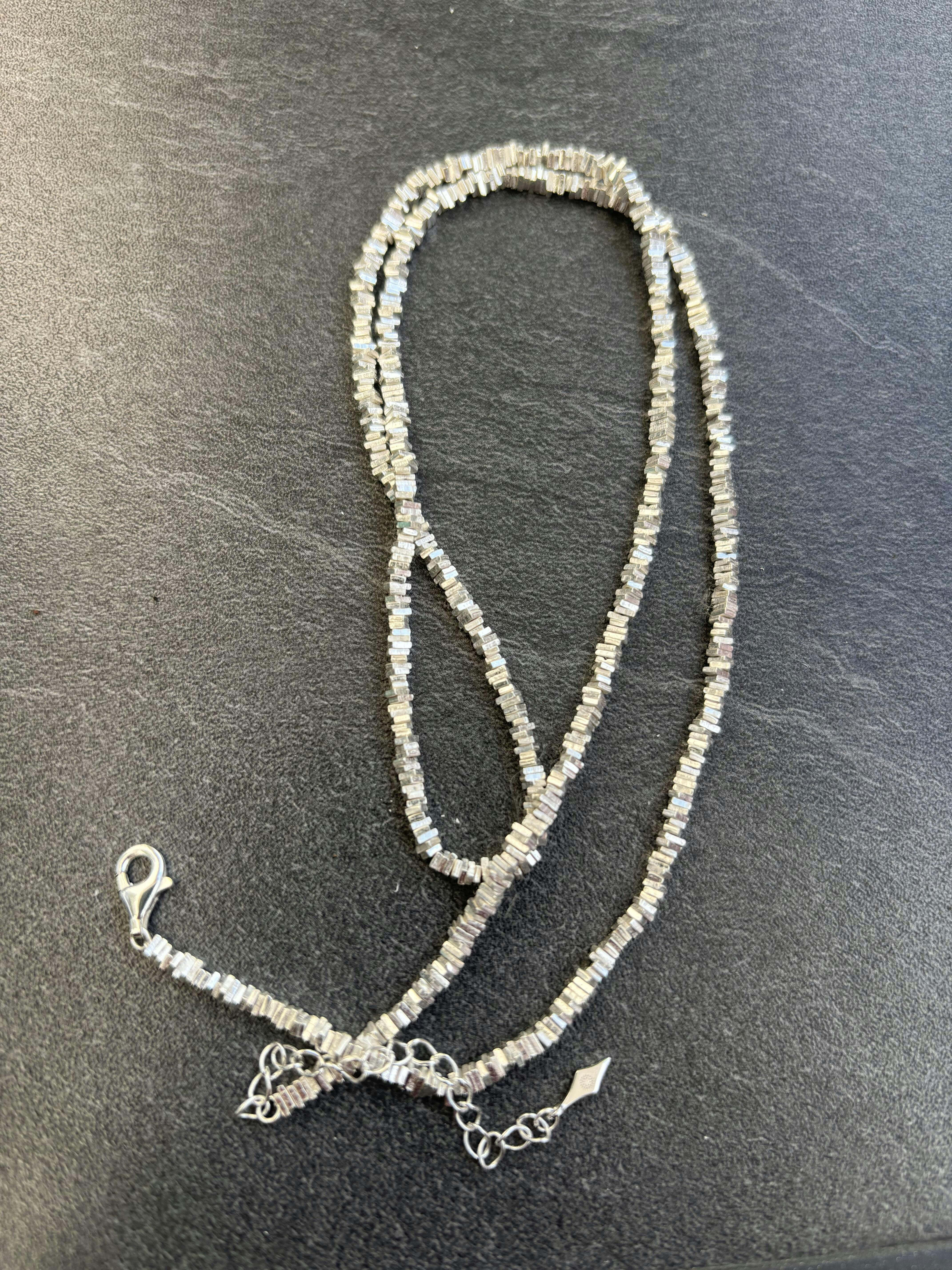 This stylish necklace and bracelet are made of finely cut and polished shiny chips. Each side of the jewelry is unique and reflects the light to create a sparkling appearance. Wear it as a single piece or layer it with others for a modern look. Absolutely it-piece!