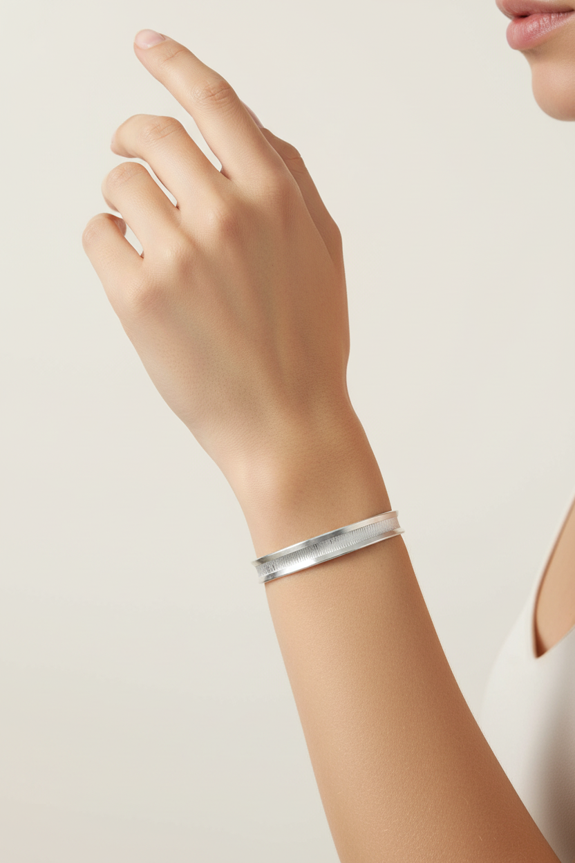 This elegant silver bangle boasts a simple yet sophisticated design. Its subtle texture lends it a delicate depth, while the open design ensures flexibility and comfort. Perfect for the modern man seeking a touch of minimalist elegance, this versatile accessory is suitable for any occasion.