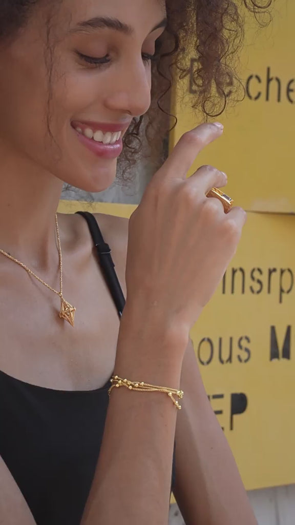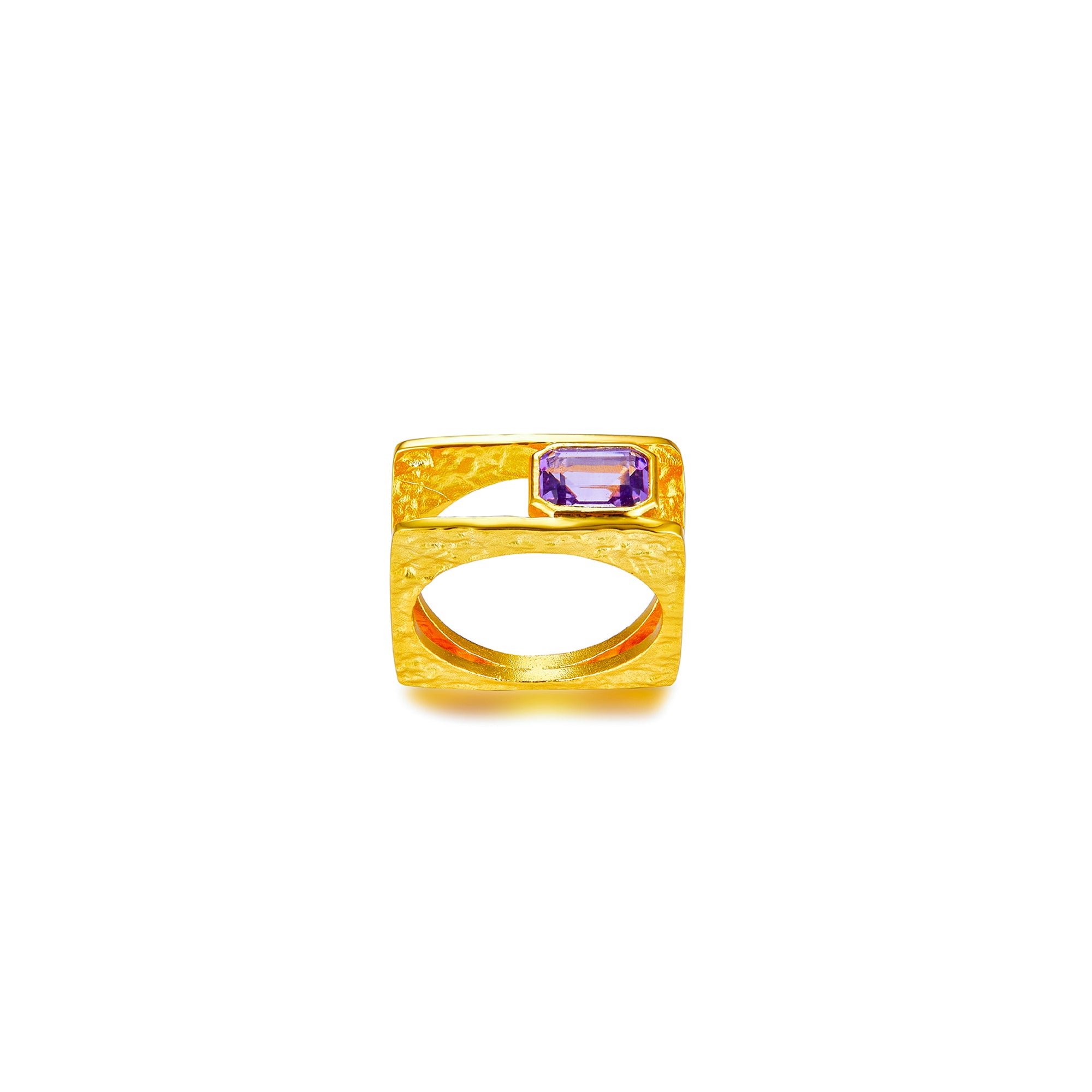 Discover the fashionable ring – made of gold-plated 925 sterling silver, it features a faceted amethyst gemstone in a central setting. With its double-layered, square structure and an elegant square amethyst setting in between, this ring embodies a unique and striking sense of style. Its modern style and eye-catching appeal make this ring the perfect accessory for special looks.
