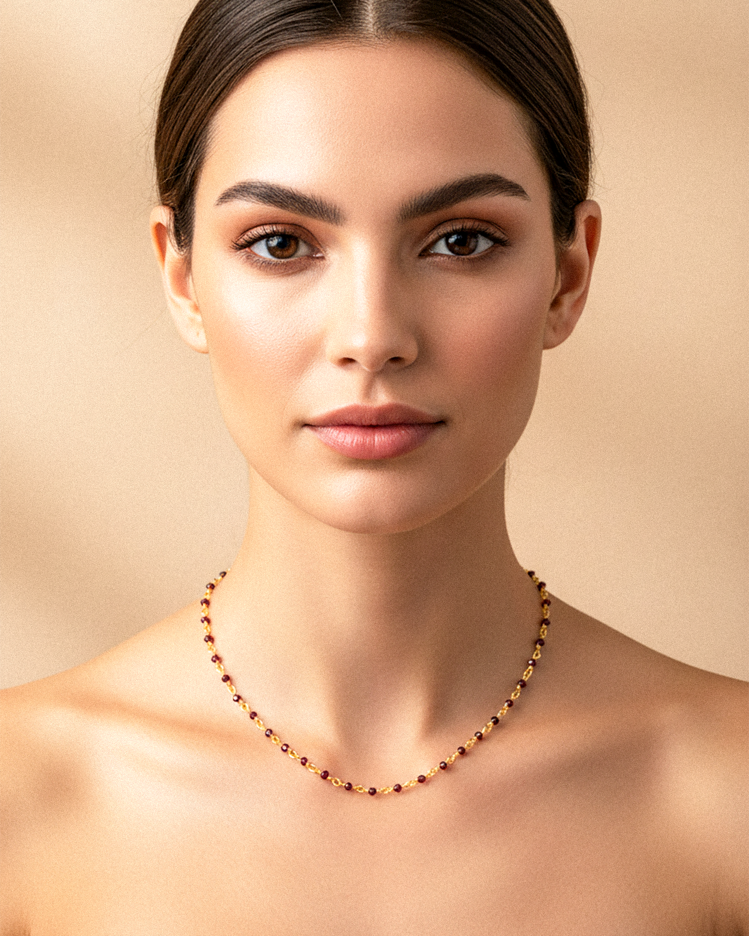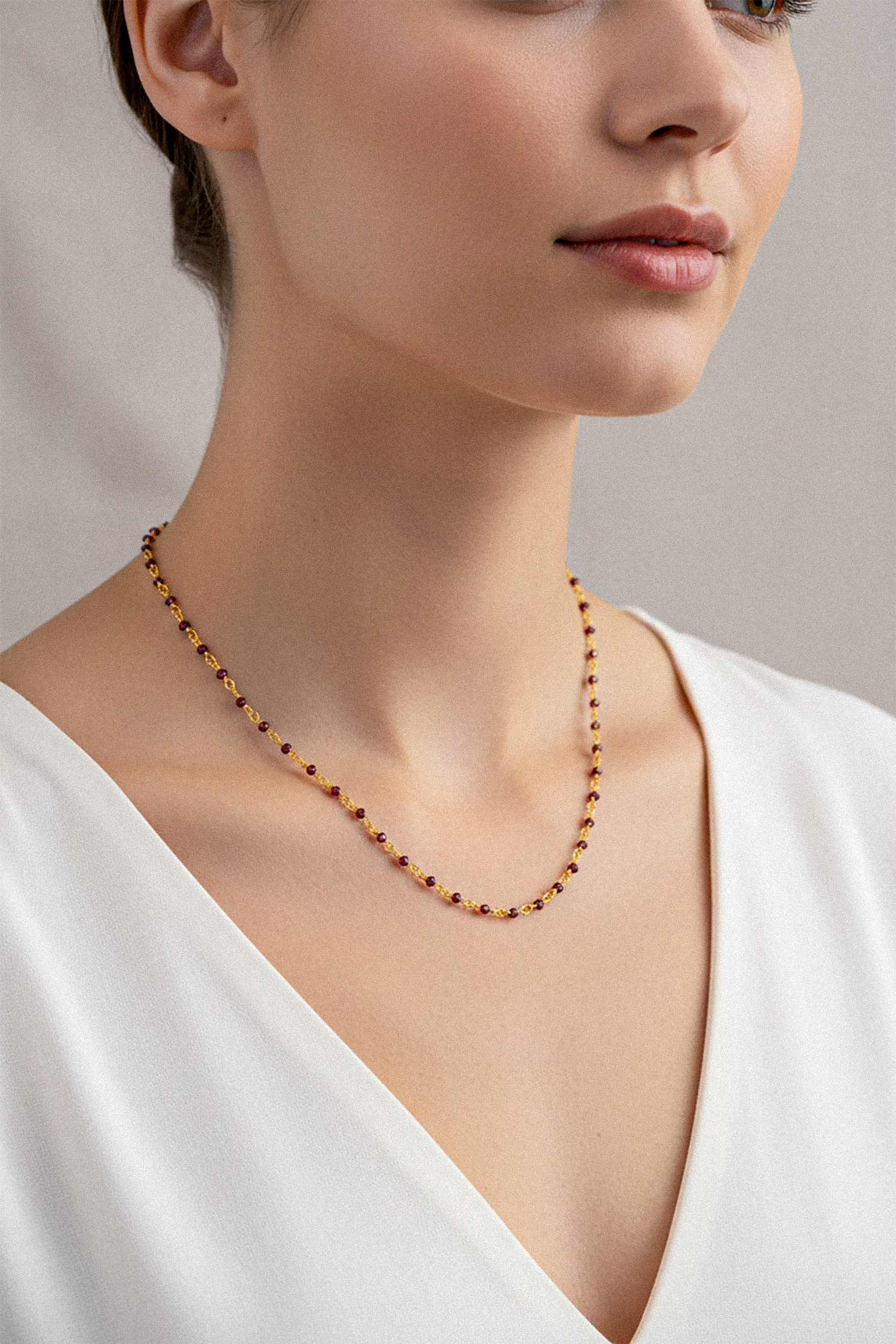 This feminine necklace with Red garnet is an elegant and luxurious piece of jewelry. The sparkling gemstone spheres made of Red garnets create a stunning focal point and make the necklace sparkle. The delicate design gives the understated women's necklace visual depth, making it a true designer piece.