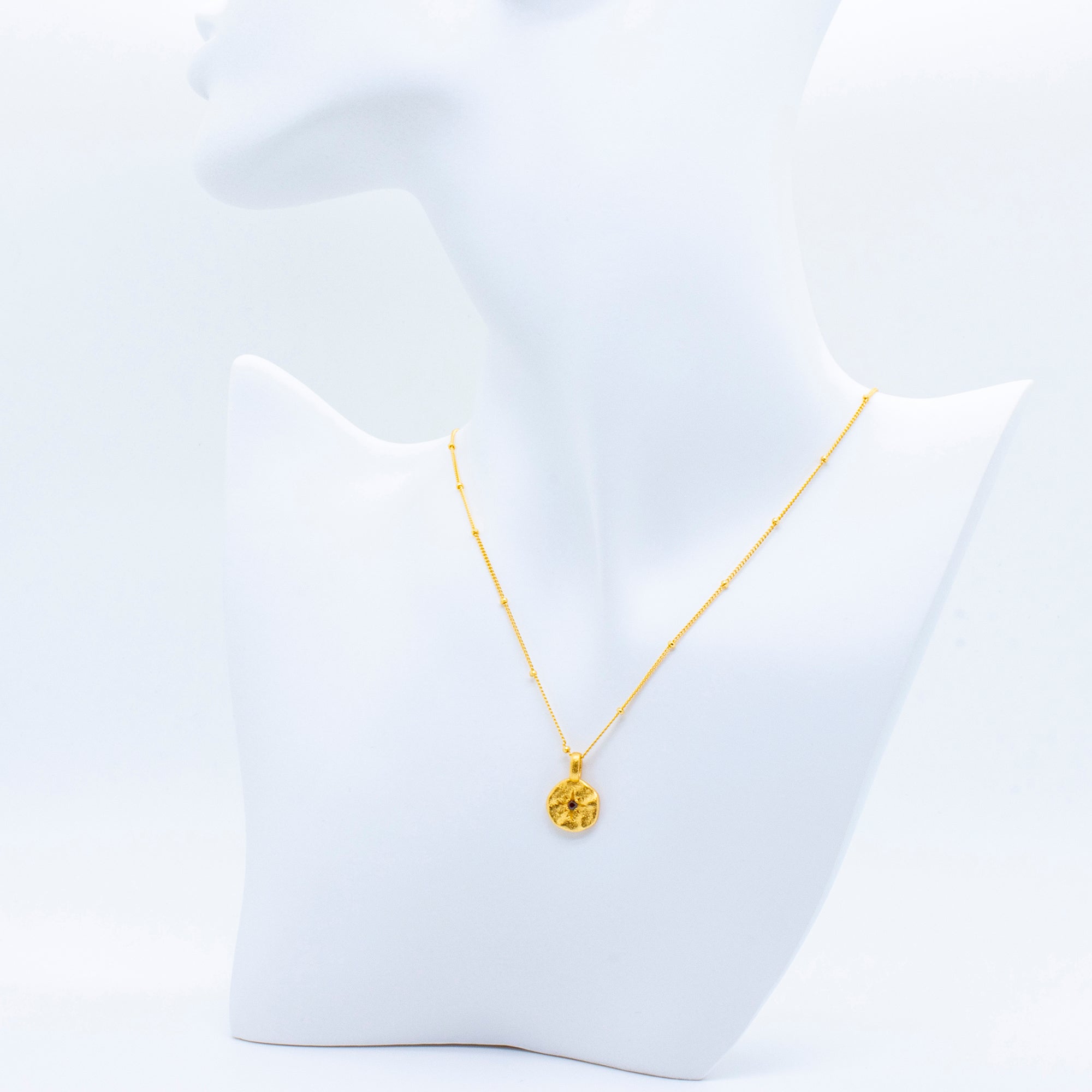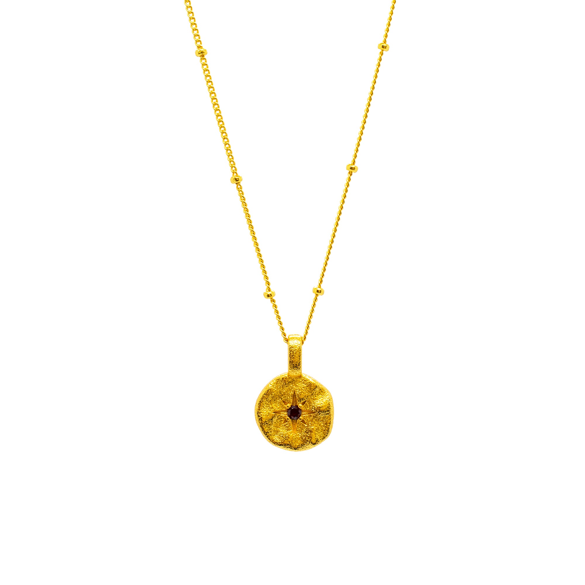This beautiful gold necklace with nugget pendant made of 925 sterling silver is a true masterpiece of jewelry art. The circular nugget pendant, decorated with a six-pointed star and a sparkling garnet stone, embodies timeless elegance and exclusivity. Wear this work of art and radiate a beguiling grace.