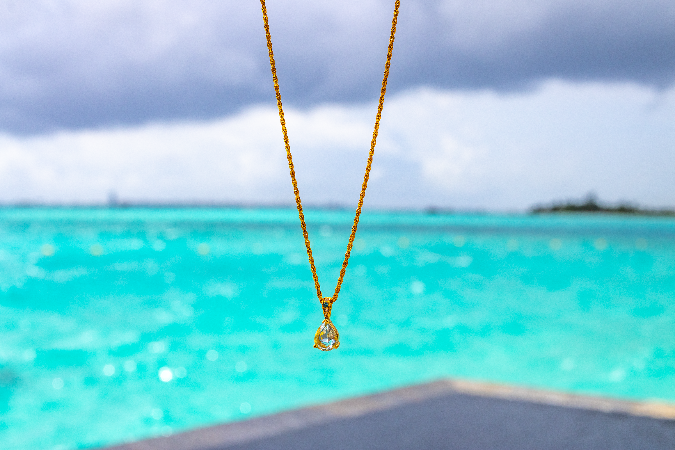 Kette flach ausgelegt – Topas Tropfen Anhänger in minimalistischer Eleganz