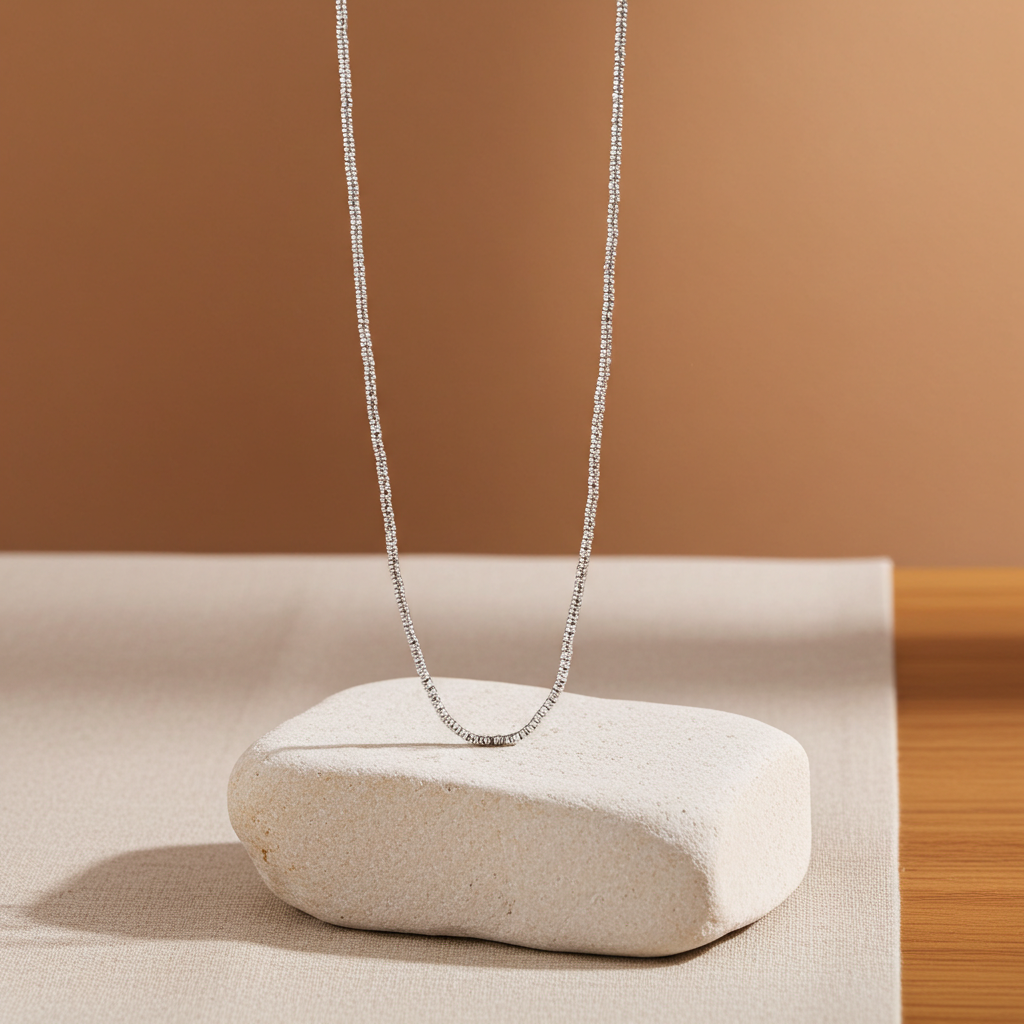 Ce collier affirme une véritable personnalité : extra long, texturé et d'une élégance intemporelle. Confectionné en argent sterling 925, il se compose de maillons fins et délicats qui scintillent subtilement à chaque mouvement – ​​idéal pour celles qui apprécient une sophistication discrète rehaussée d'une touche d'originalité.