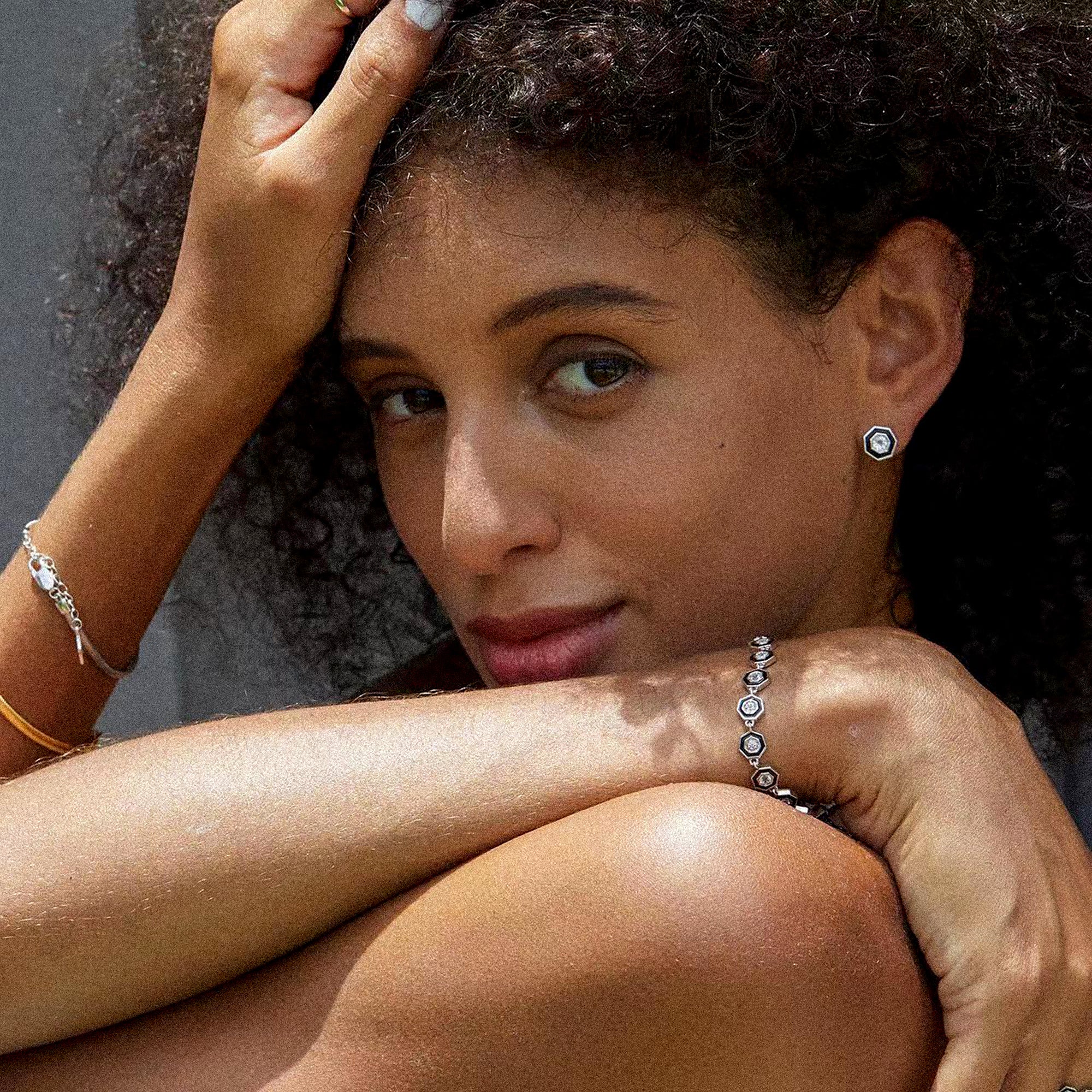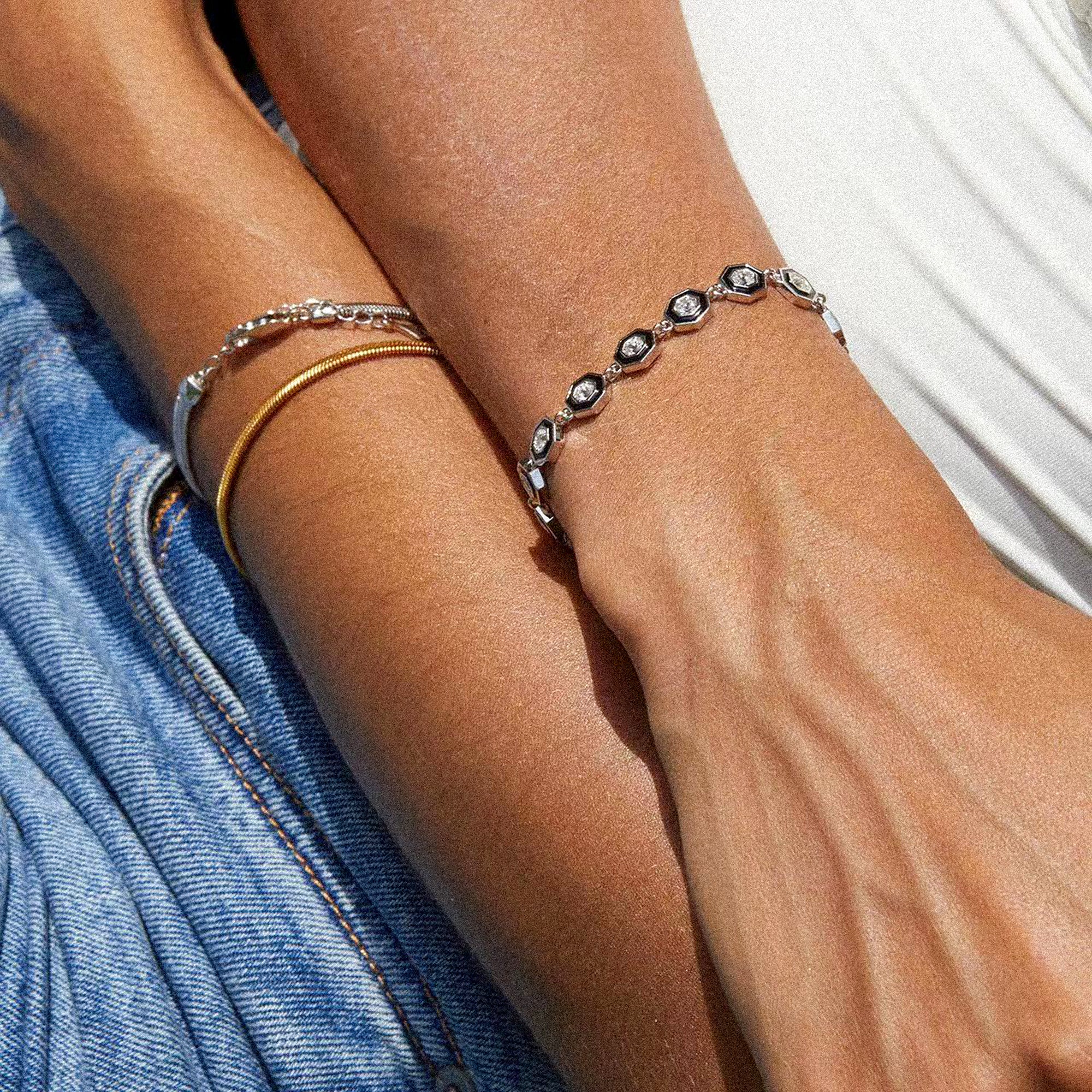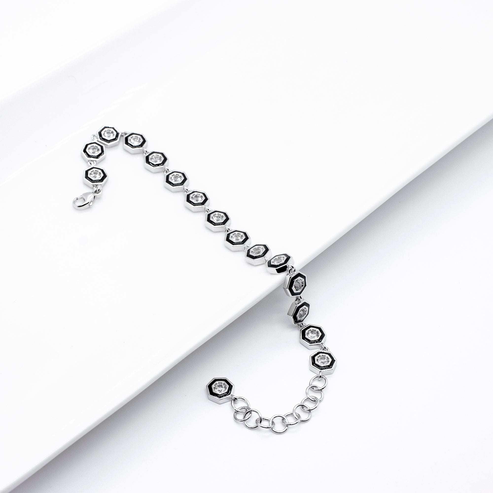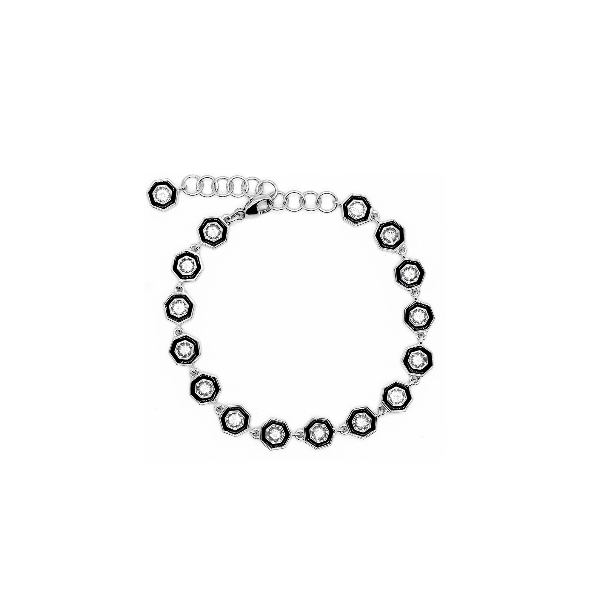 Ce bracelet en argent sublimera votre style. Cet accessoire luxueux se compose d'éléments polygonaux noirs entrelacés, rehaussés de délicates topazes. Son éclat intense et scintillant en fait une pièce de créateur idéale pour toutes vos tenues, et lui confère une élégance élancée.