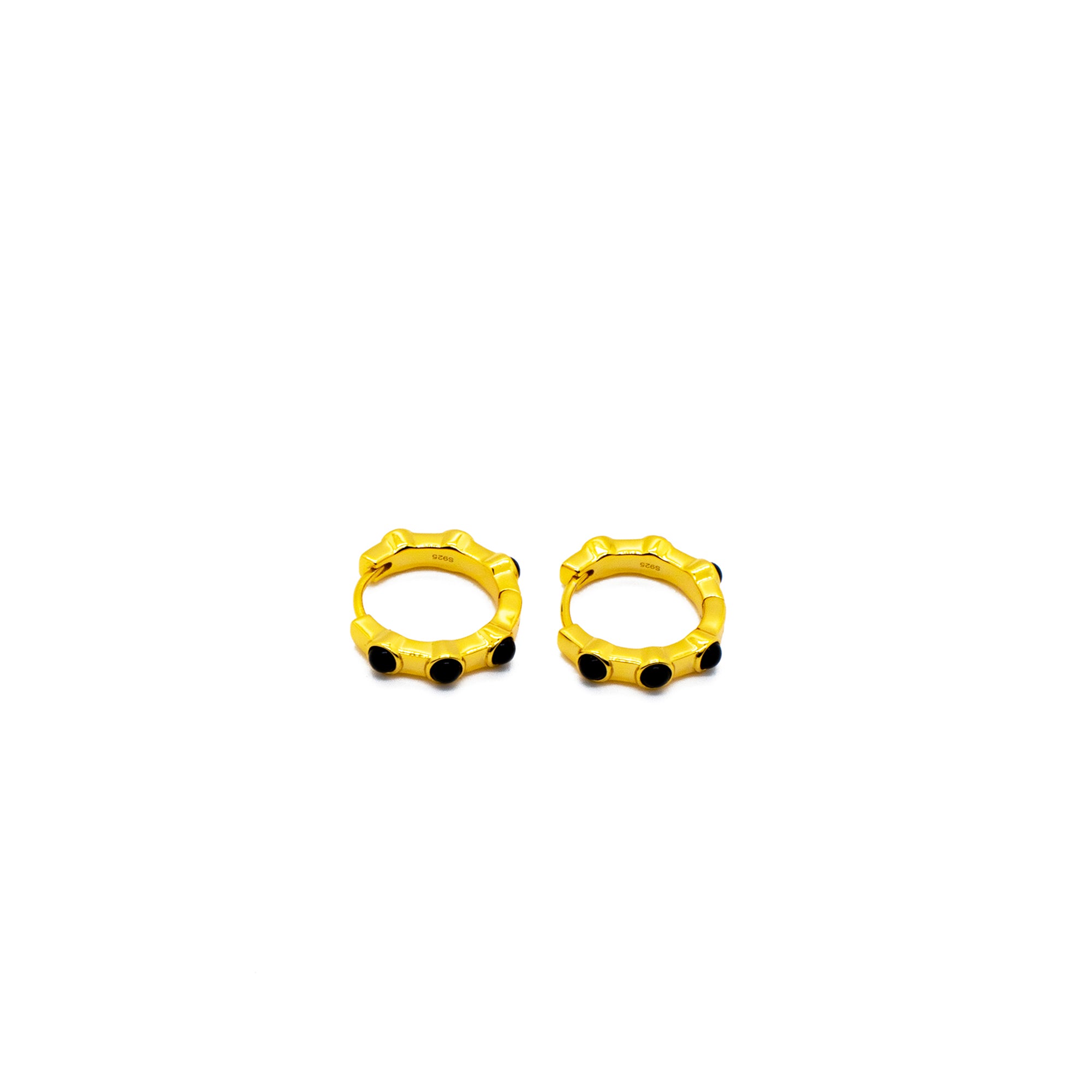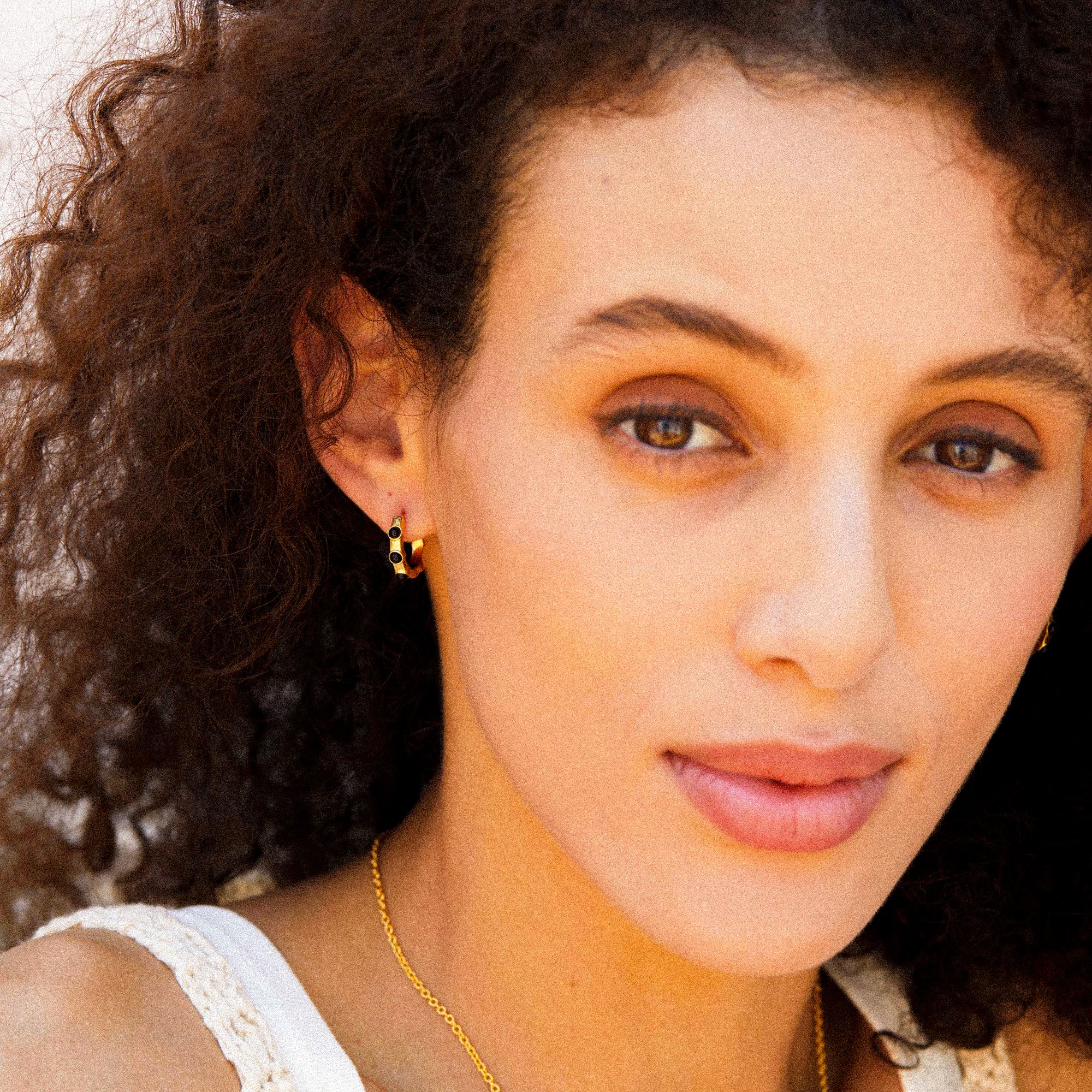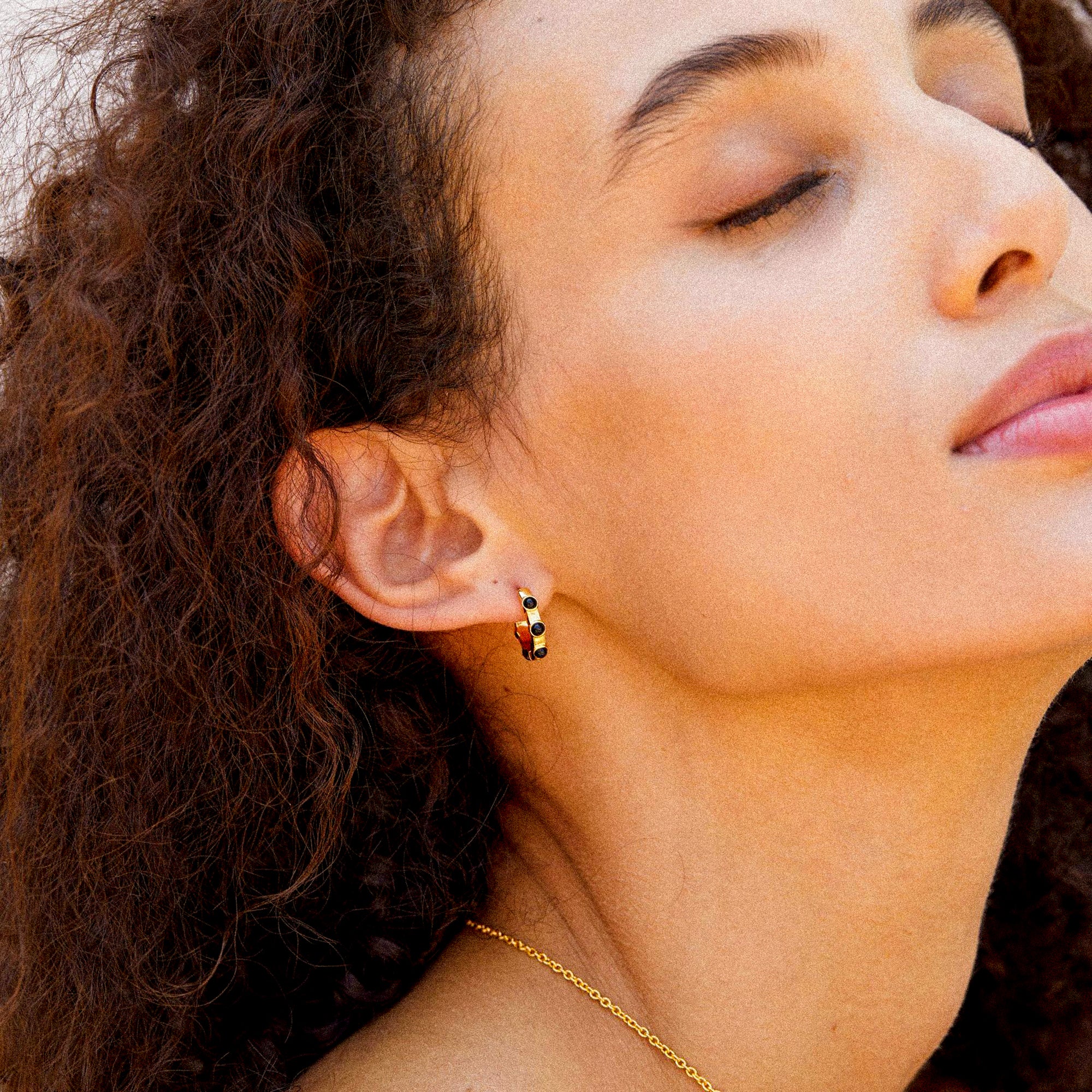 Ces créoles sont confectionnées en argent sterling 925 de la plus haute qualité et plaquées or. Les points d'onyx noir leur confèrent une élégance moderne, en faisant un accessoire raffiné pour toutes les occasions. Grâce à leur design discret, ces créoles dorées se portent aussi bien au quotidien qu'avec des tenues de soirée. Elles s'harmonisent parfaitement avec d'autres bijoux en or ou en onyx et sont un incontournable pour les adeptes d'une élégance minimaliste.