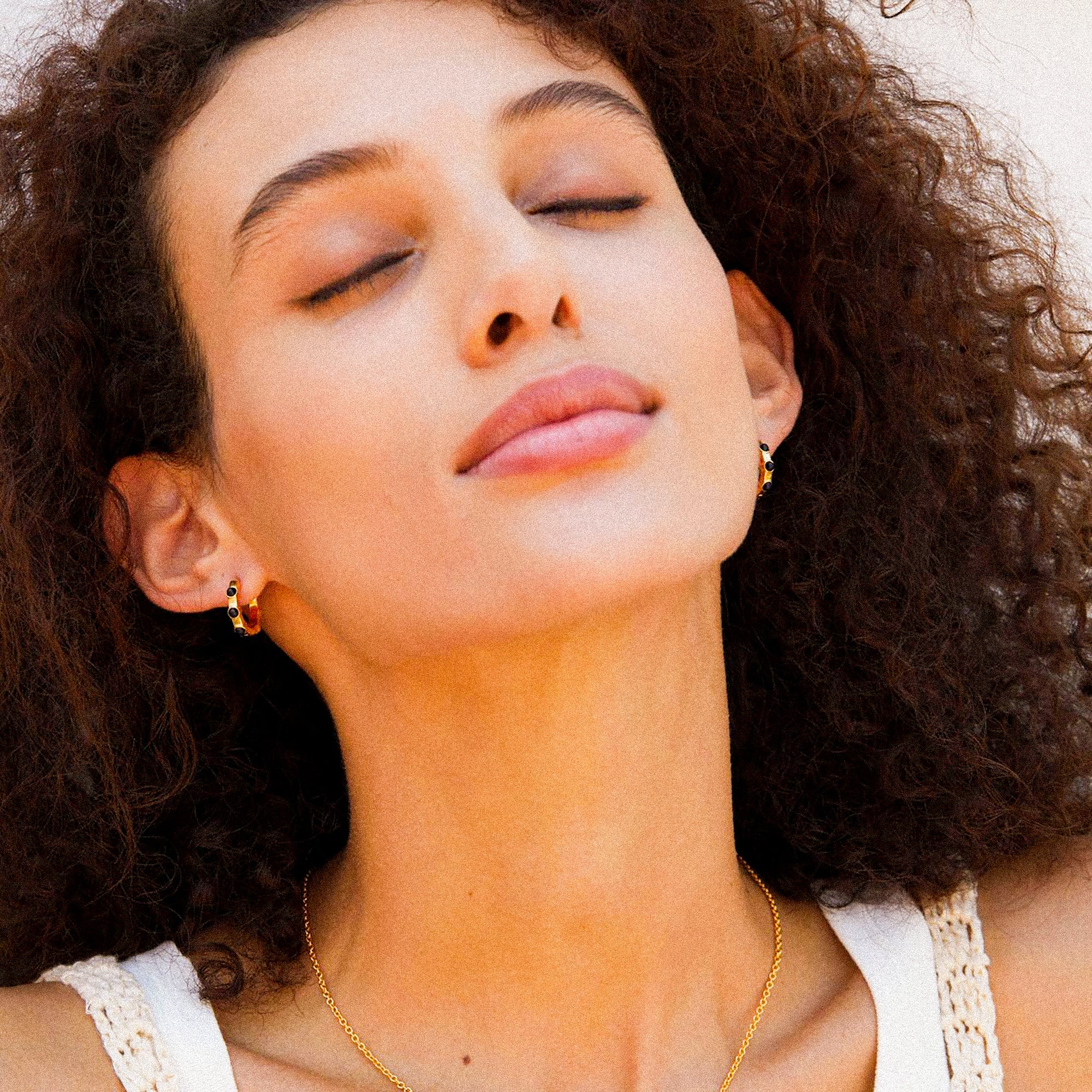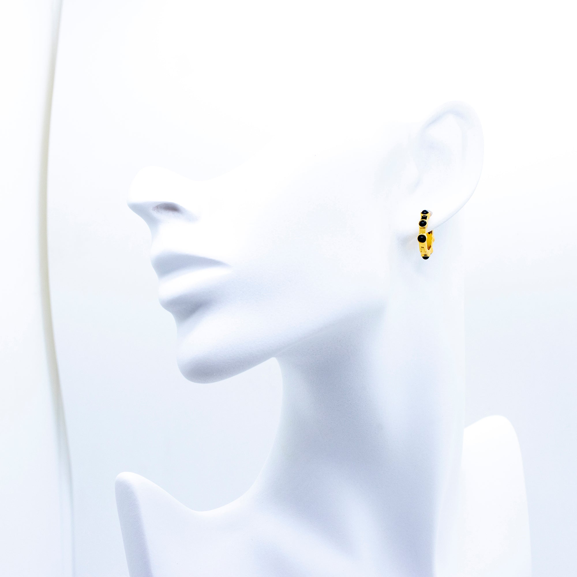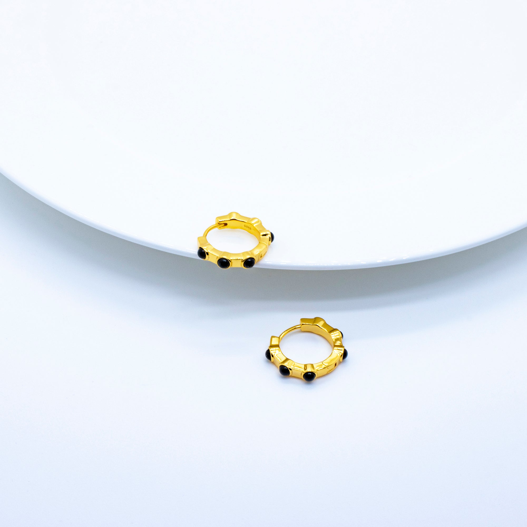 Ces créoles sont confectionnées en argent sterling 925 de la plus haute qualité et plaquées or. Les points d'onyx noir leur confèrent une élégance moderne, en faisant un accessoire raffiné pour toutes les occasions. Grâce à leur design discret, ces créoles dorées se portent aussi bien au quotidien qu'avec des tenues de soirée. Elles s'harmonisent parfaitement avec d'autres bijoux en or ou en onyx et sont un incontournable pour les adeptes d'une élégance minimaliste.