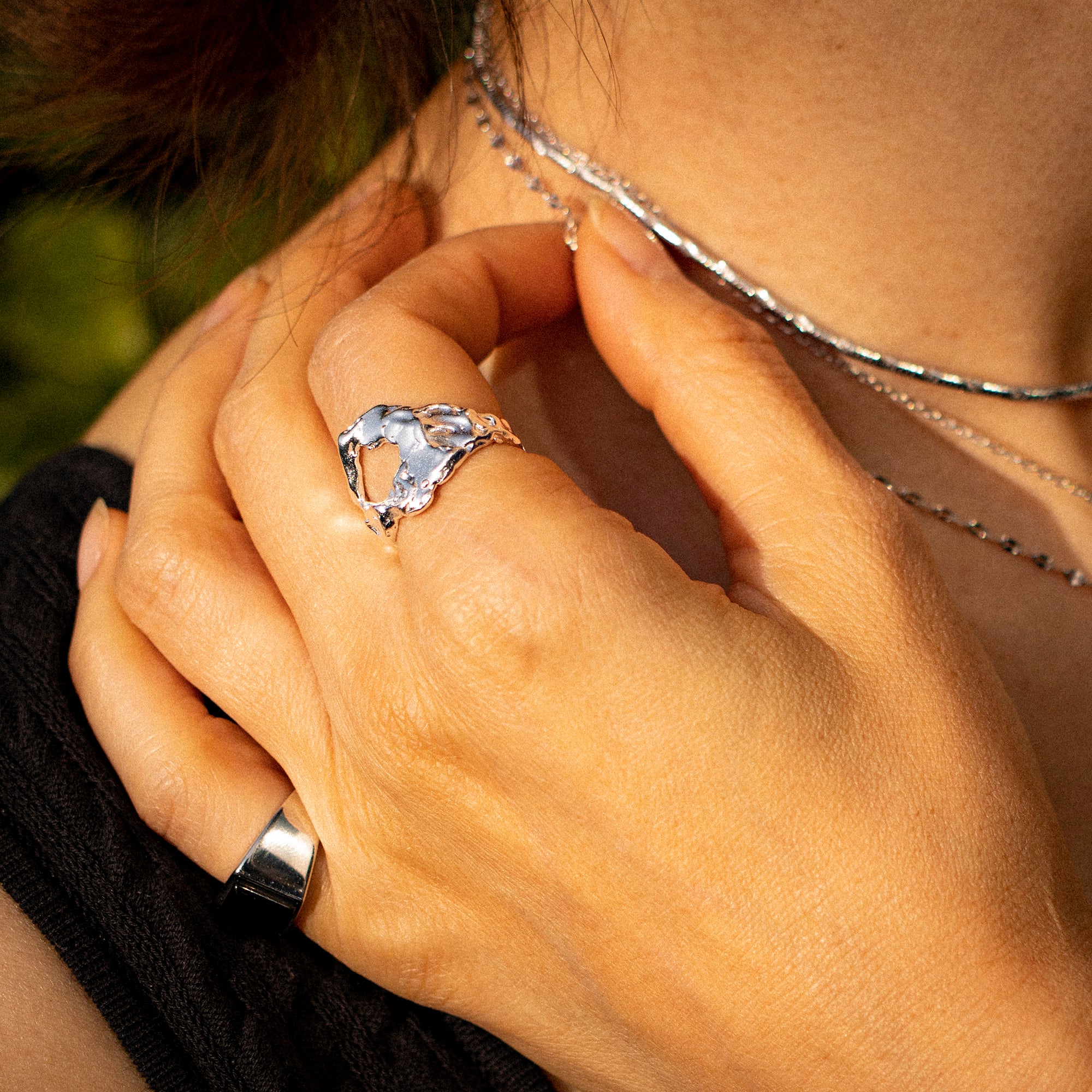 Cette bague moderne en argent sterling 925 est un accessoire raffiné qui incarne l'individualité et un style impeccable. Son design délicat associe une finition texturée et captivante, évoquant le métal en fusion, à une esthétique vibrante qui confère à chaque femme une touche artistique. Un trou naturel ajoute une note d'élégance supplémentaire.