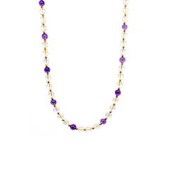 Ce délicat collier pour femme allie l'élégance intemporelle de l'améthyste et la pureté du cristal de quartz. Les sphères alternées aux multiples facettes en violet et transparent confèrent au bijou une profondeur particulière et une touche de luxe. La pièce intermédiaire dorée souligne le look élégant et fait de la chaîne un accroche-regard en toute occasion. On dit que l’améthyste a des propriétés apaisantes et harmonisantes, tandis que le quartz cristallin est synonyme de clarté et de pureté. Un bijou non seulement beau mais aussi énergique.