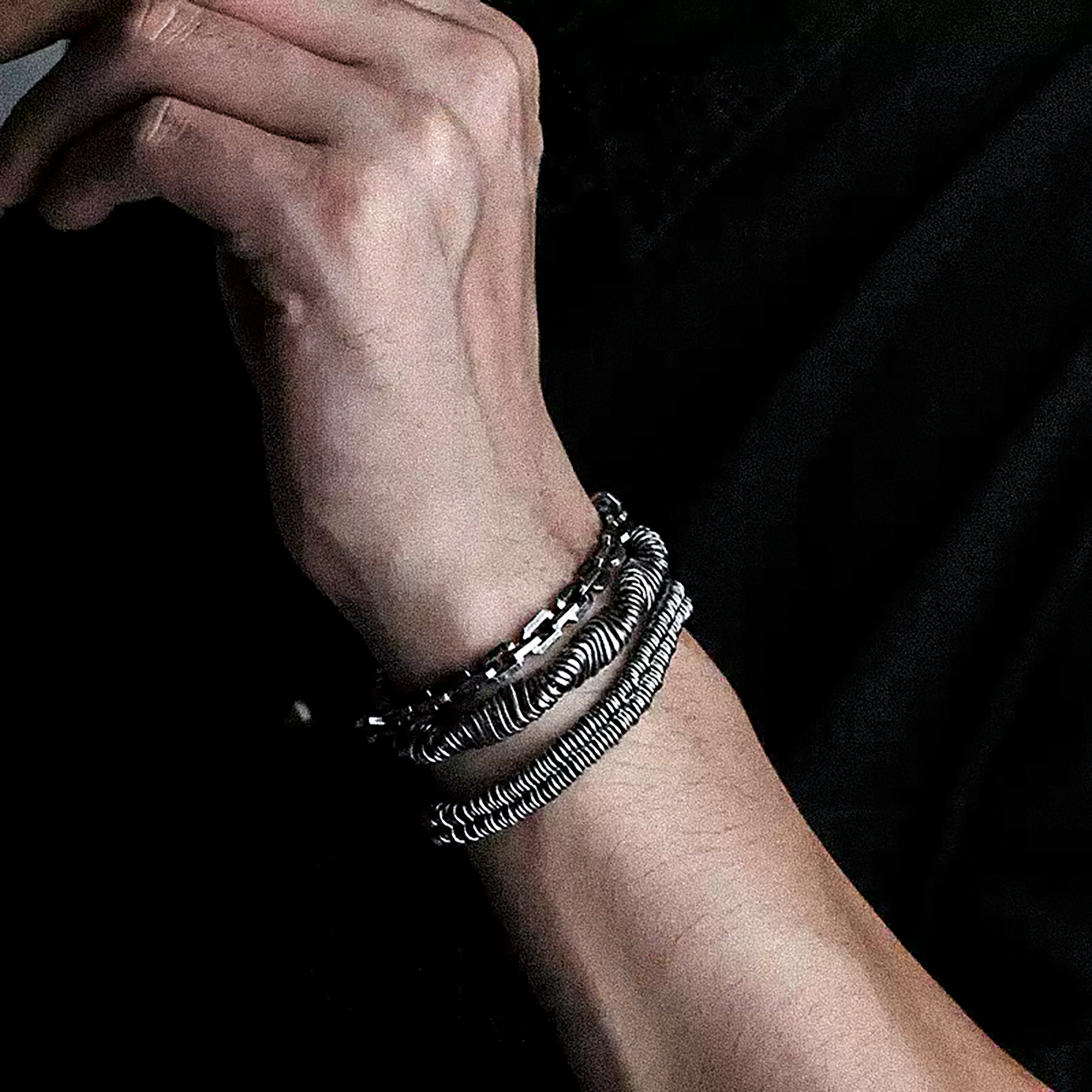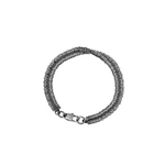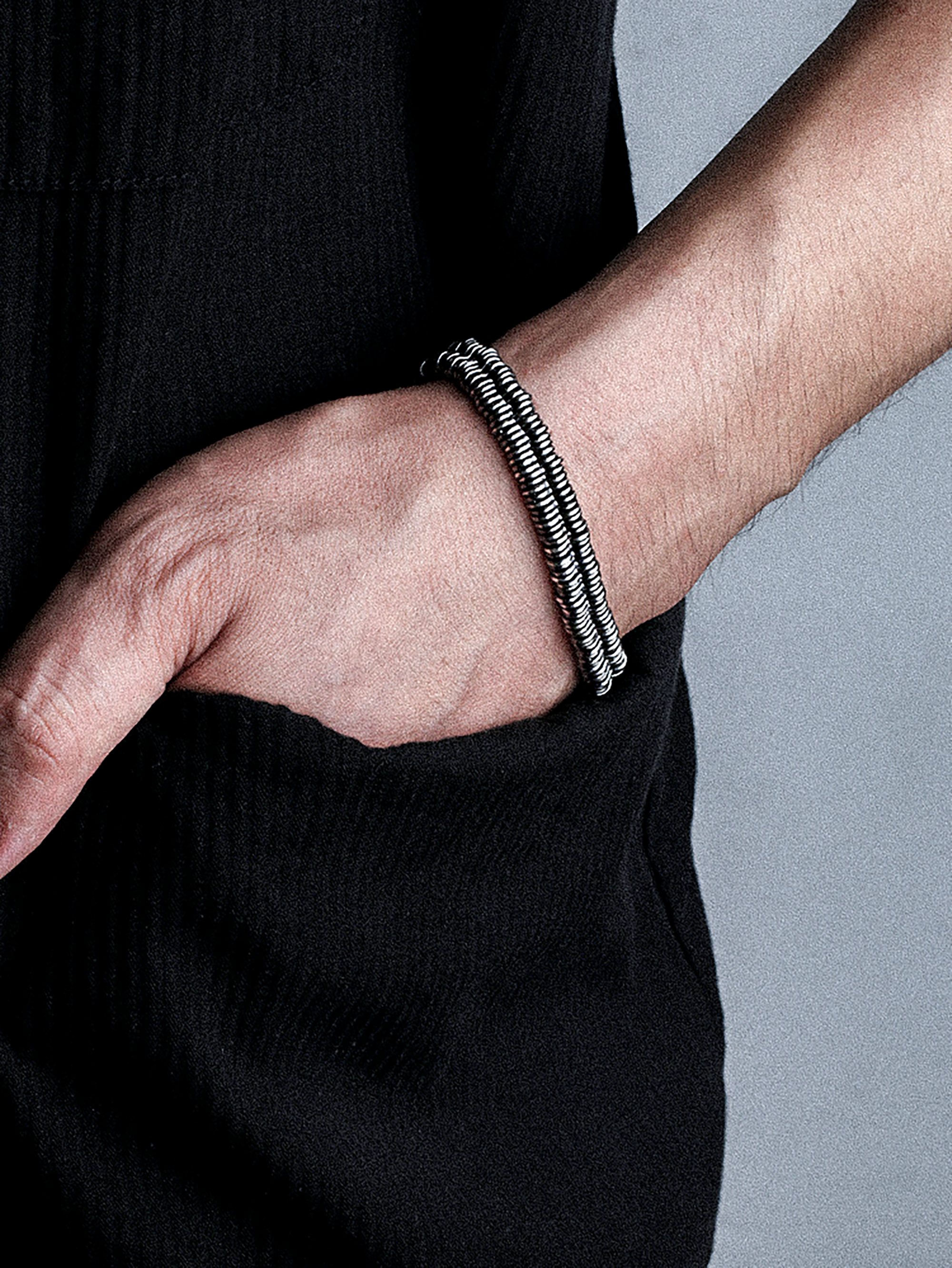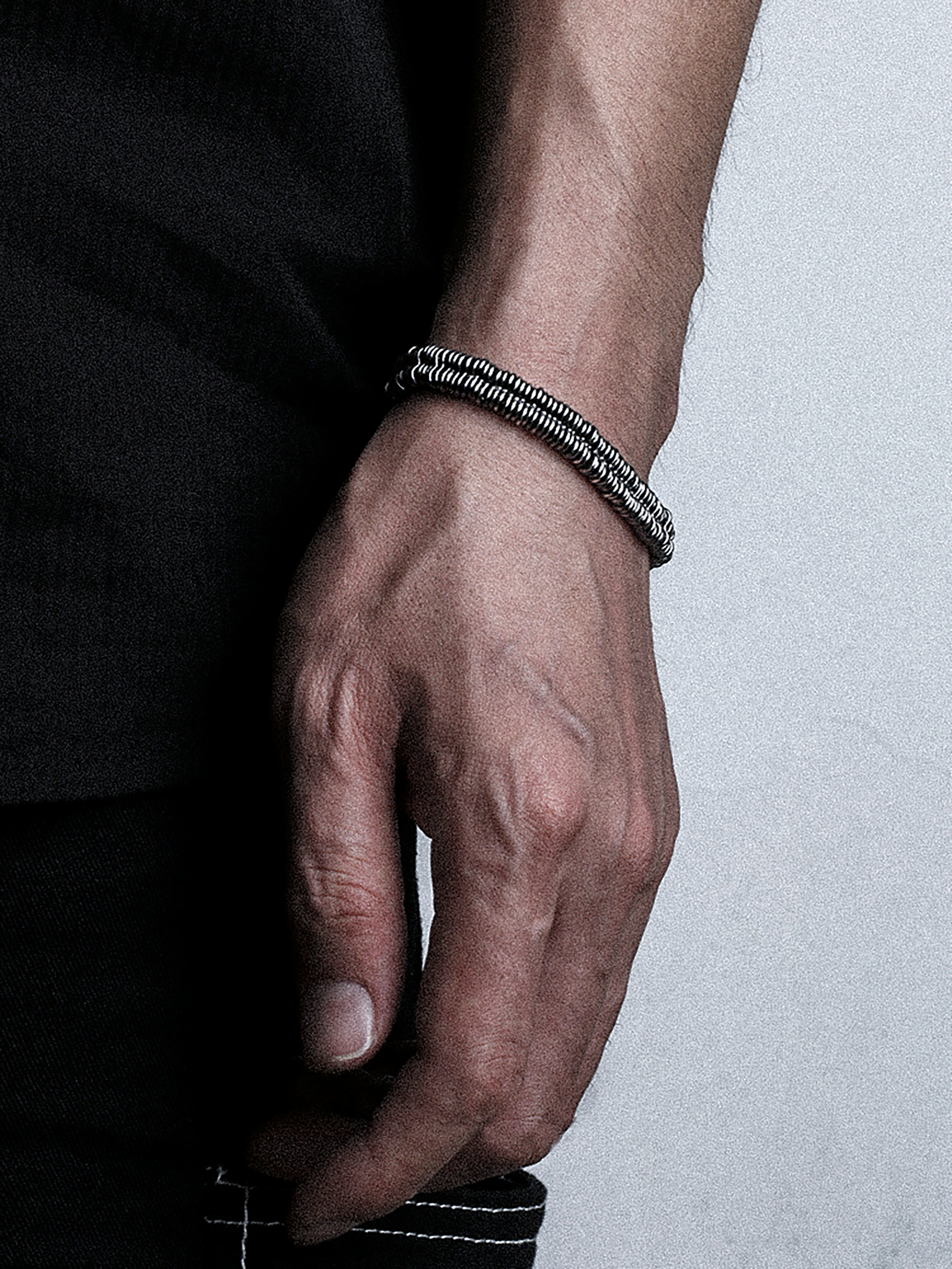 Ce bracelet en argent est fait de Ce bracelet en argent massif 925 séduit par sa structure en spirale à deux niveaux, composée de segments plats et rapprochés. Chaque segment s'intègre harmonieusement au suivant, créant un effet visuel dynamique et captivant. Sa patine subtile lui confère un charme vintage, tandis que son fermoir robuste assure un maintien parfait. Idéal pour les hommes et les femmes soucieux de leur style et à la recherche d'un accessoire unique.