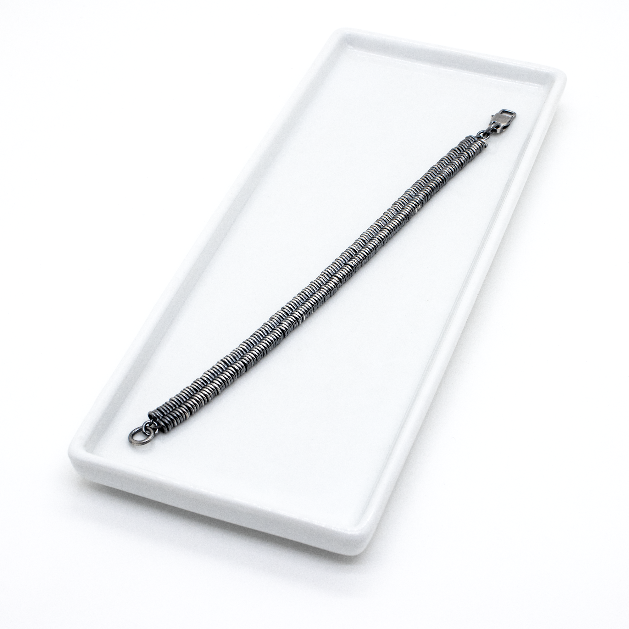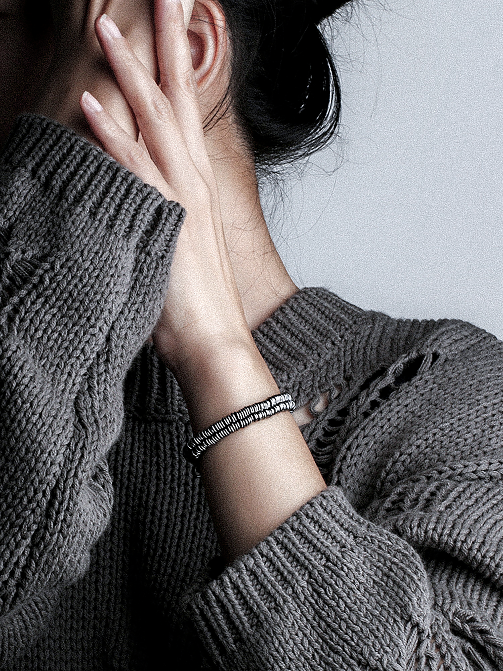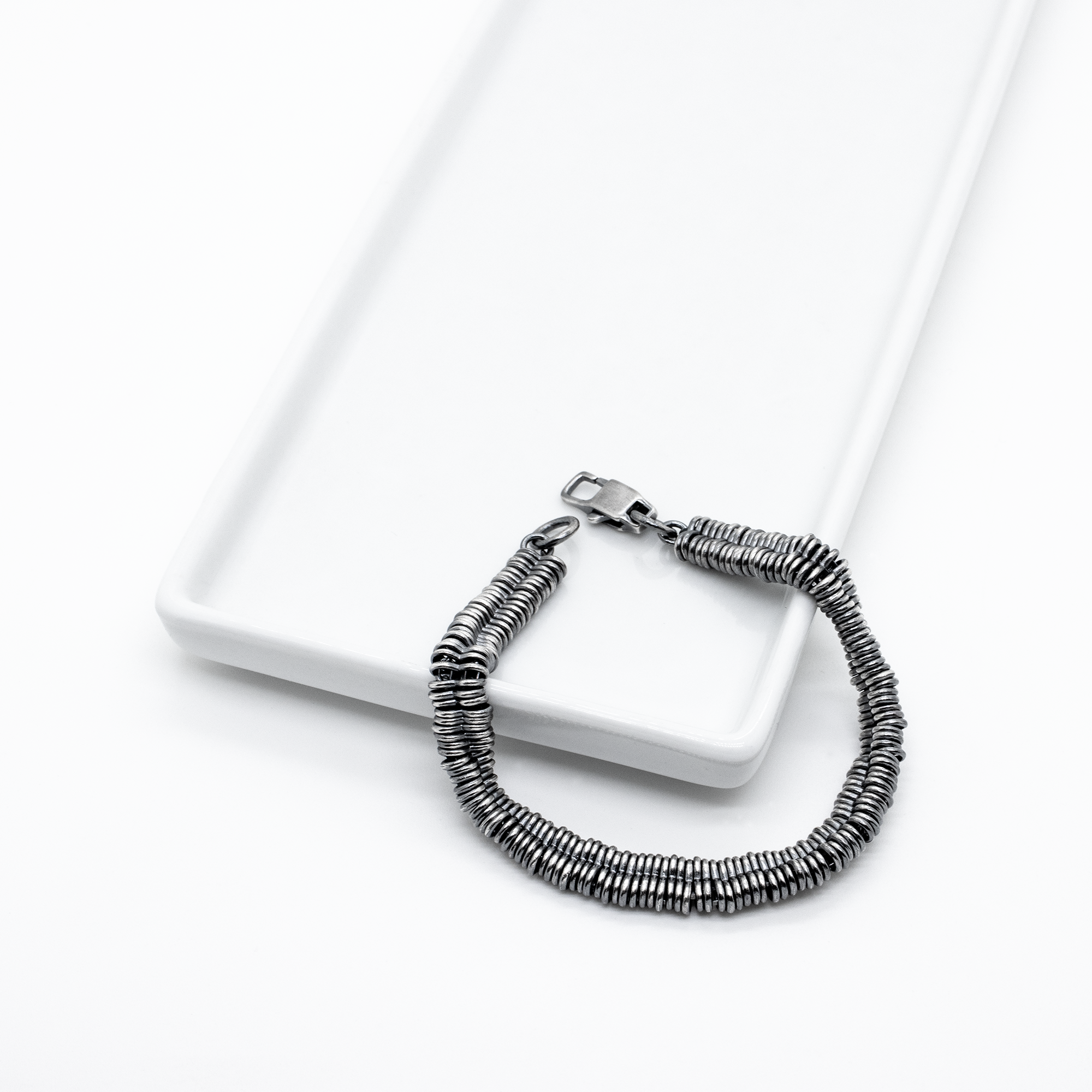 Ce bracelet en argent est fait de Ce bracelet en argent massif 925 séduit par sa structure en spirale à deux niveaux, composée de segments plats et rapprochés. Chaque segment s'intègre harmonieusement au suivant, créant un effet visuel dynamique et captivant. Sa patine subtile lui confère un charme vintage, tandis que son fermoir robuste assure un maintien parfait. Idéal pour les hommes et les femmes soucieux de leur style et à la recherche d'un accessoire unique.