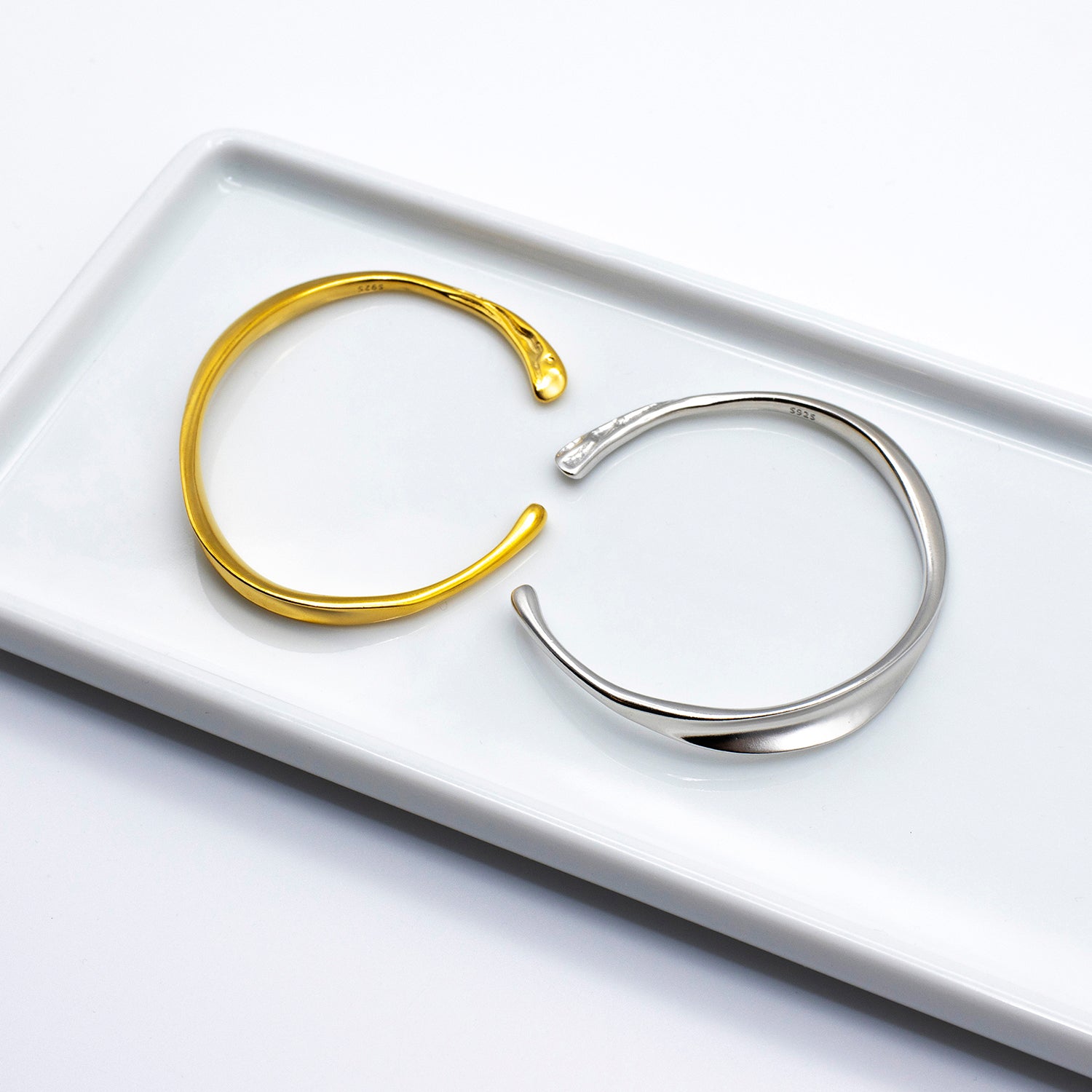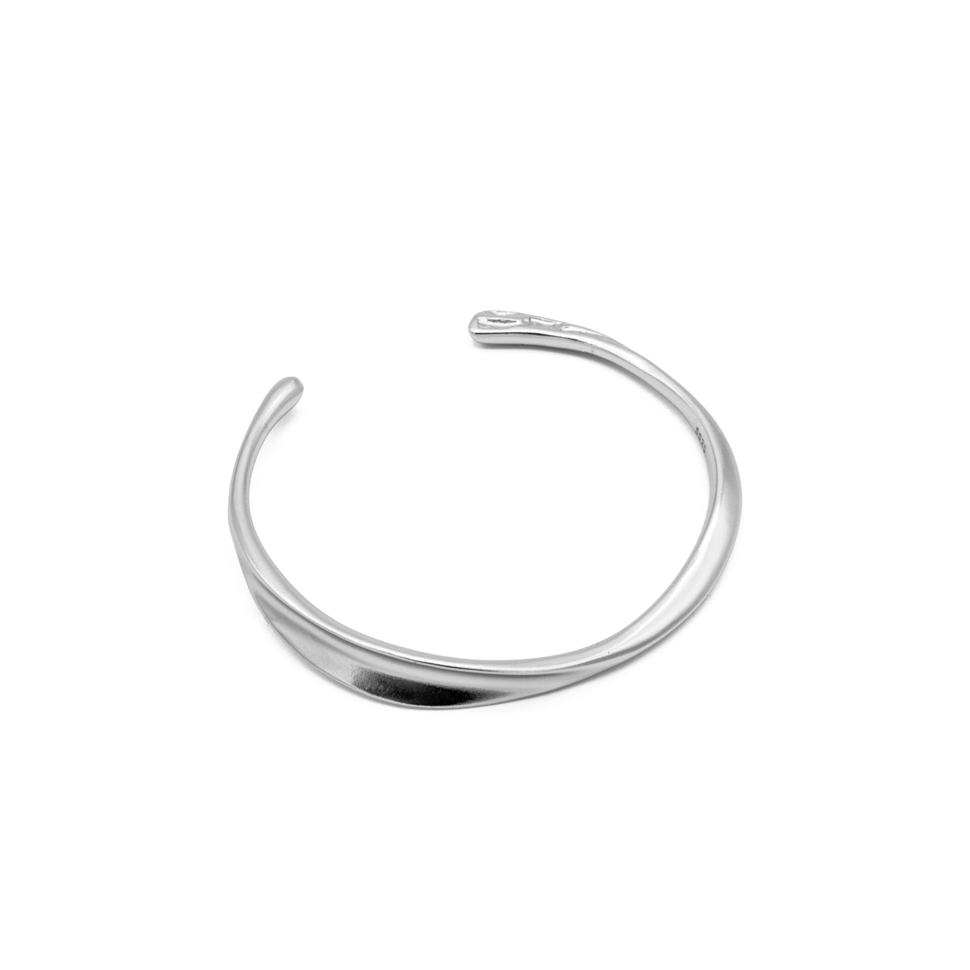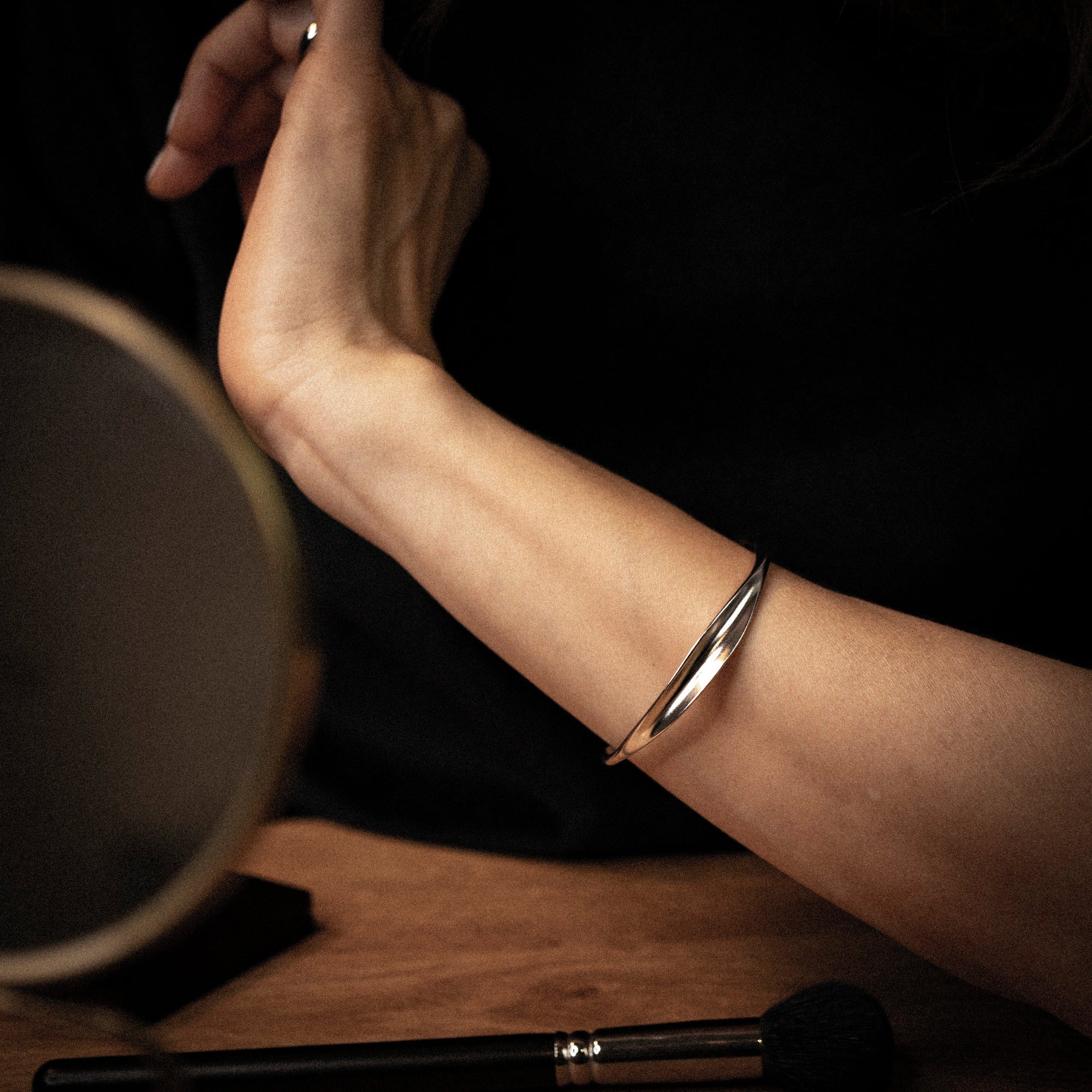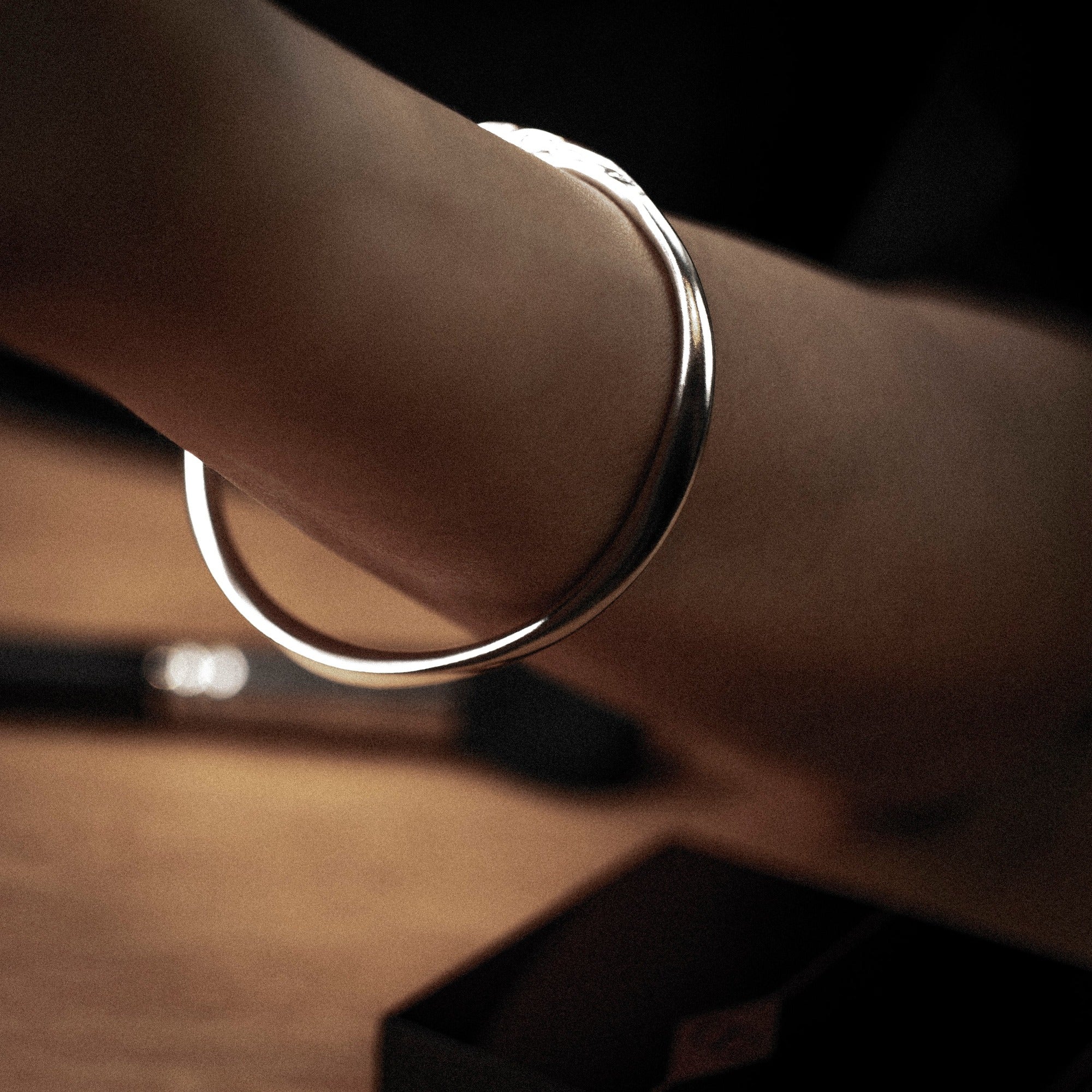 Ce bracelet ouvert s'ajuste facilement au poignet et se porte aussi bien seul qu'avec d'autres bracelets fins. Il est particulièrement élégant associé à la bague assortie ou à d'autres bracelets en argent.