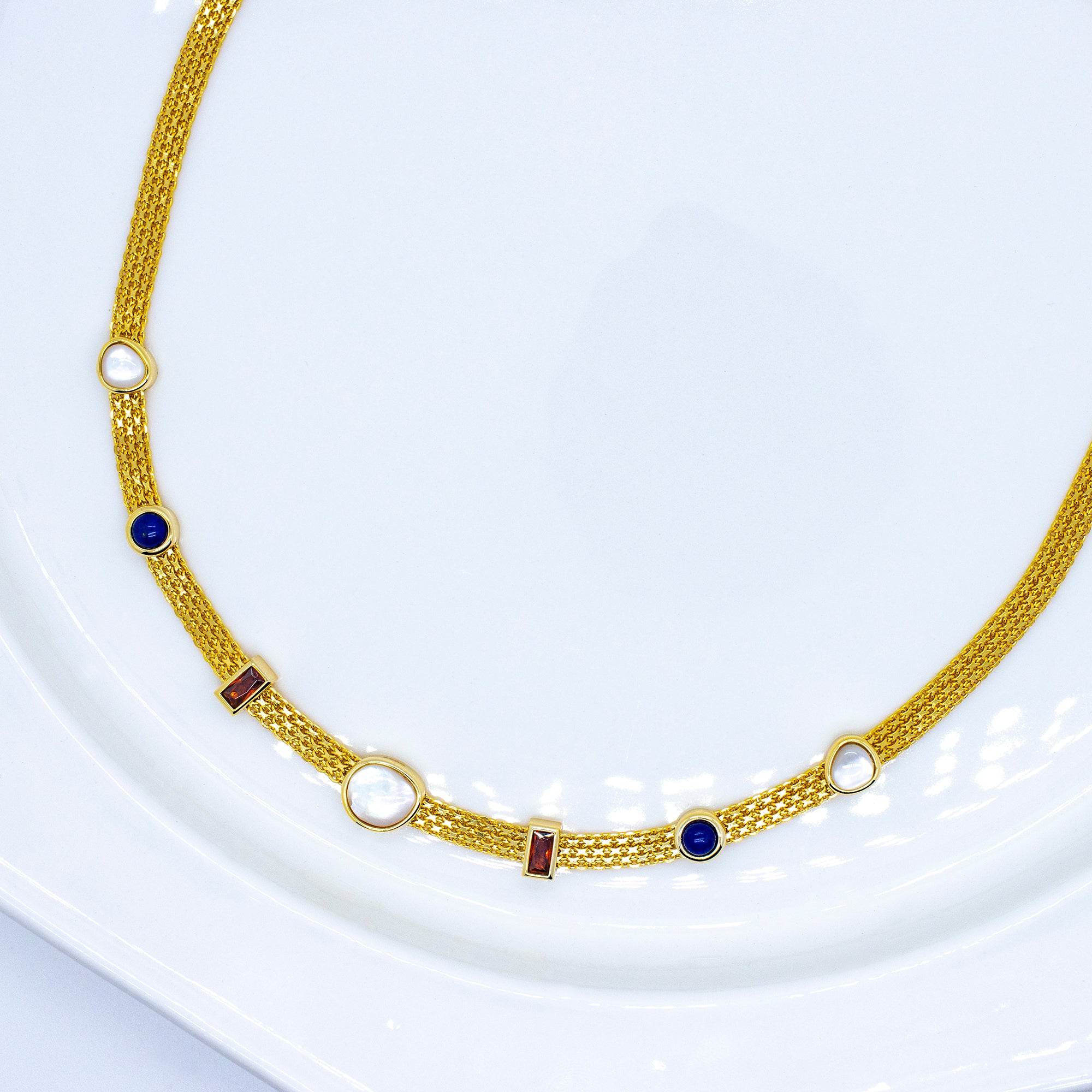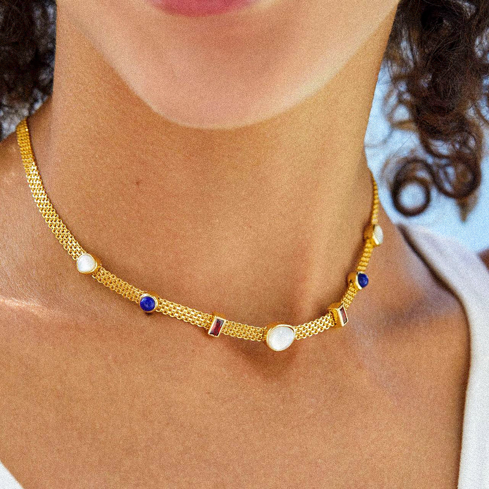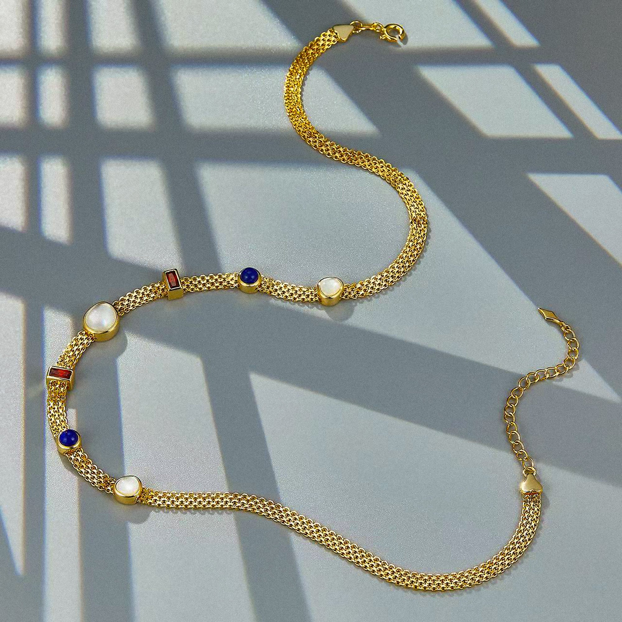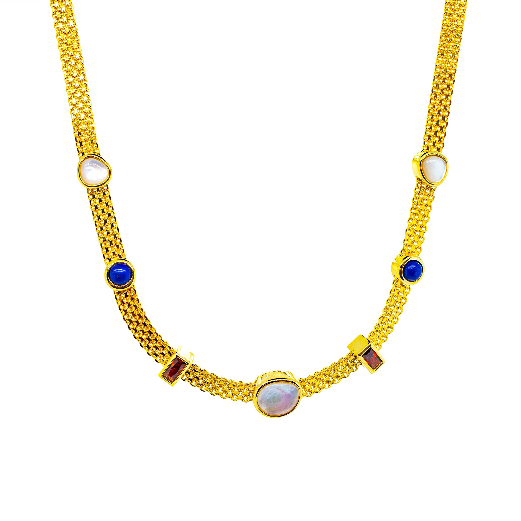 Cette chaîne vénitienne tressée en argent 925 et ornée de pierres précieuses est un ajout confortable et élégant à votre garde-robe. La chaîne se compose de nombreux maillons finement tressés et est ornée de pierres précieuses taillées aux couleurs naturelles telles que la nacre, le lapis-lazuli et le zircon rouge, qui assurent une apparence élégante. Profitez d'une touche de luxe avec ce collier luxueux.