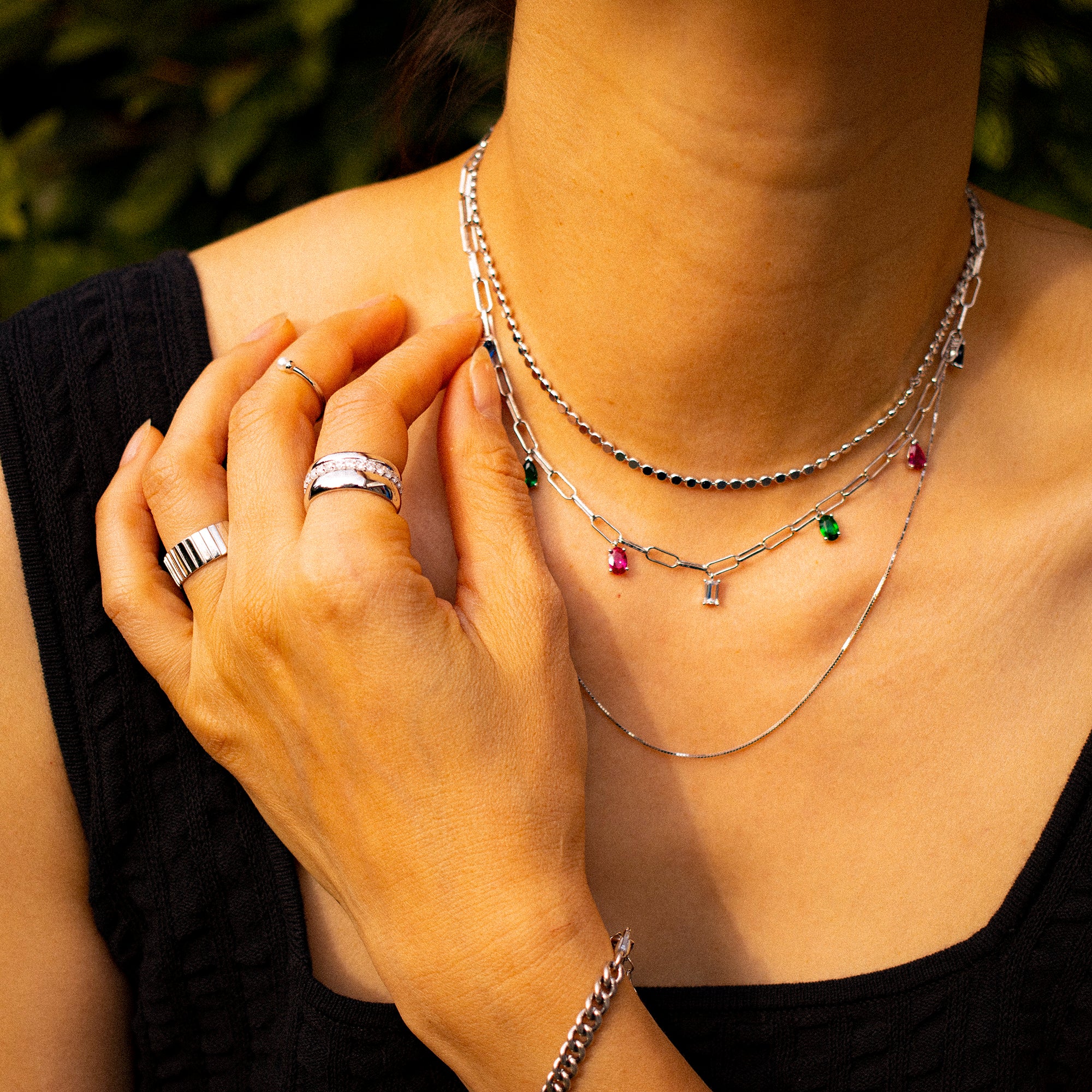 Ce collier et ce bracelet élégants sont constitués d'éclats brillants finement coupés et polis. Chaque face du bijou est unique et reflète la lumière pour créer un aspect étincelant. Portez-le seul ou superposez-le avec d'autres pour un look moderne. Absolument une pièce incontournable !