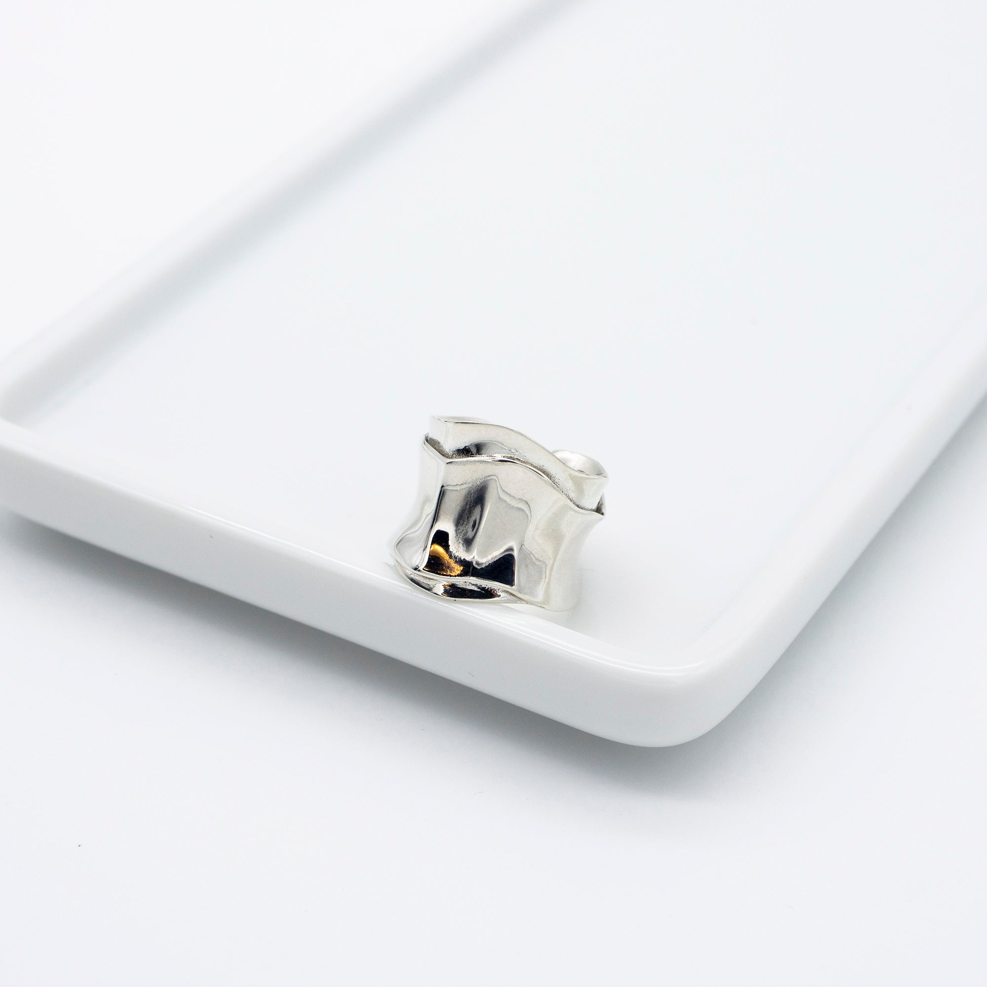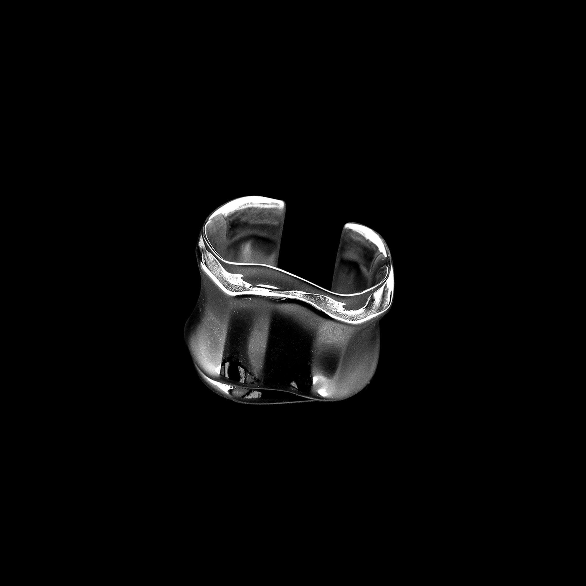 Cette bague de créateur, à la fois robuste et raffinée, est parfaite portée seule pour un luxe minimaliste, ou associée à d'autres bagues pour un effet classique. Son design à deux niveaux crée des jeux de lumière dynamiques, idéaux pour des tenues élégantes ou pour un contraste stylé avec le cuir et le denim.