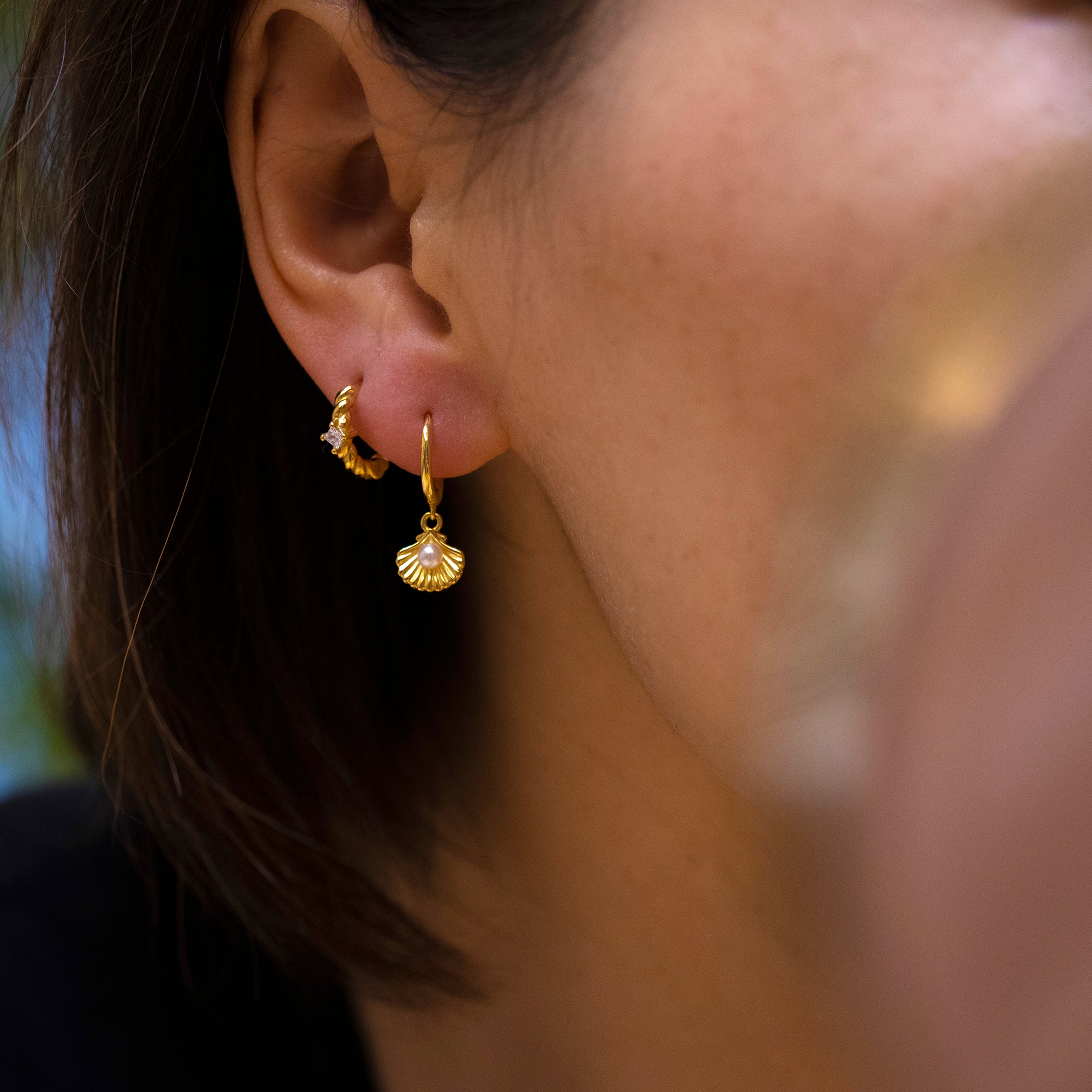 Die FAYES 925 Silber Creolen mit Muschel Anhänger in Gold vereinen maritime Leichtigkeit mit zeitloser Eleganz. Jedes Detail ist sorgfältig gearbeitet – von den zarten Creolen bis zum funkelnden Perlenanhänger.