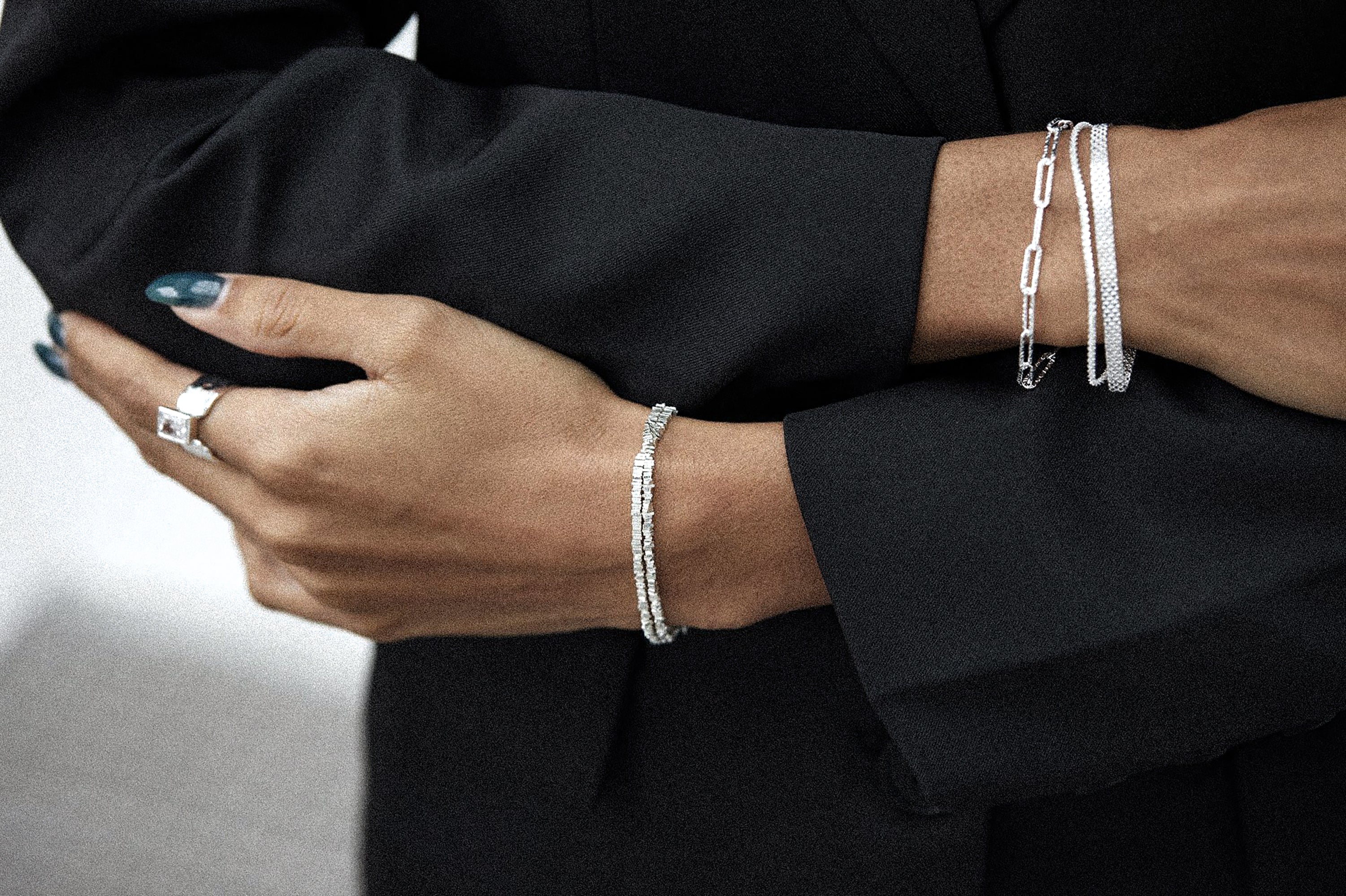 Diese stilvolle Halskette und Armkette bestehen aus fein geschliffenen und polierten, glänzenden Splittern. Jede Seite des Schmucks ist einzigartig und reflektiert das Licht, um ein funkelndes Erscheinungsbild zu kreieren. Tragen Sie es als Einzelstück oder übereinander mit anderen für einen modernen Look. Absolut It-Piece!