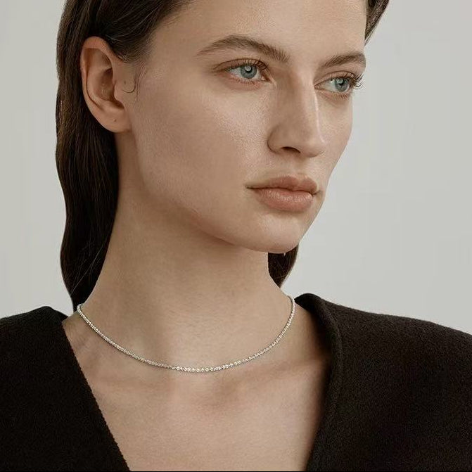 Gabrielle Halskette getragen von Frau im Laying Look– feines Fischgräten-Design aus 925er Silber