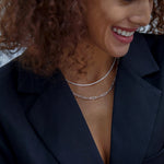 Gabrielle Halskette getragen von Frau im Laying Look– feines Fischgräten-Design aus 925er Silber