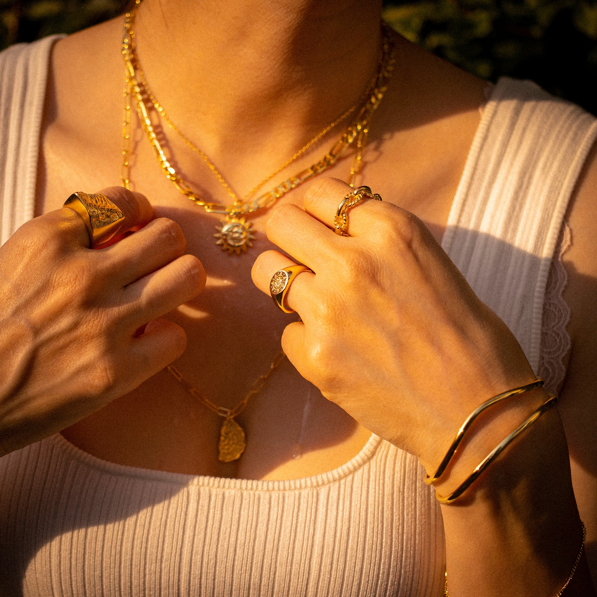 Für Menschen, die ein ausdrucksvolles Statement setzen möchten, ist der geheimnisvolle Goldring aus 925er Sterlingsilber der perfekte Begleiter: Er beeindruckt mit geheimnisvollem Strahlenmuster, verziert mit einem feinen Zirkonia. Ein luxuriöses Accessoire von bezaubernder Schönheit.