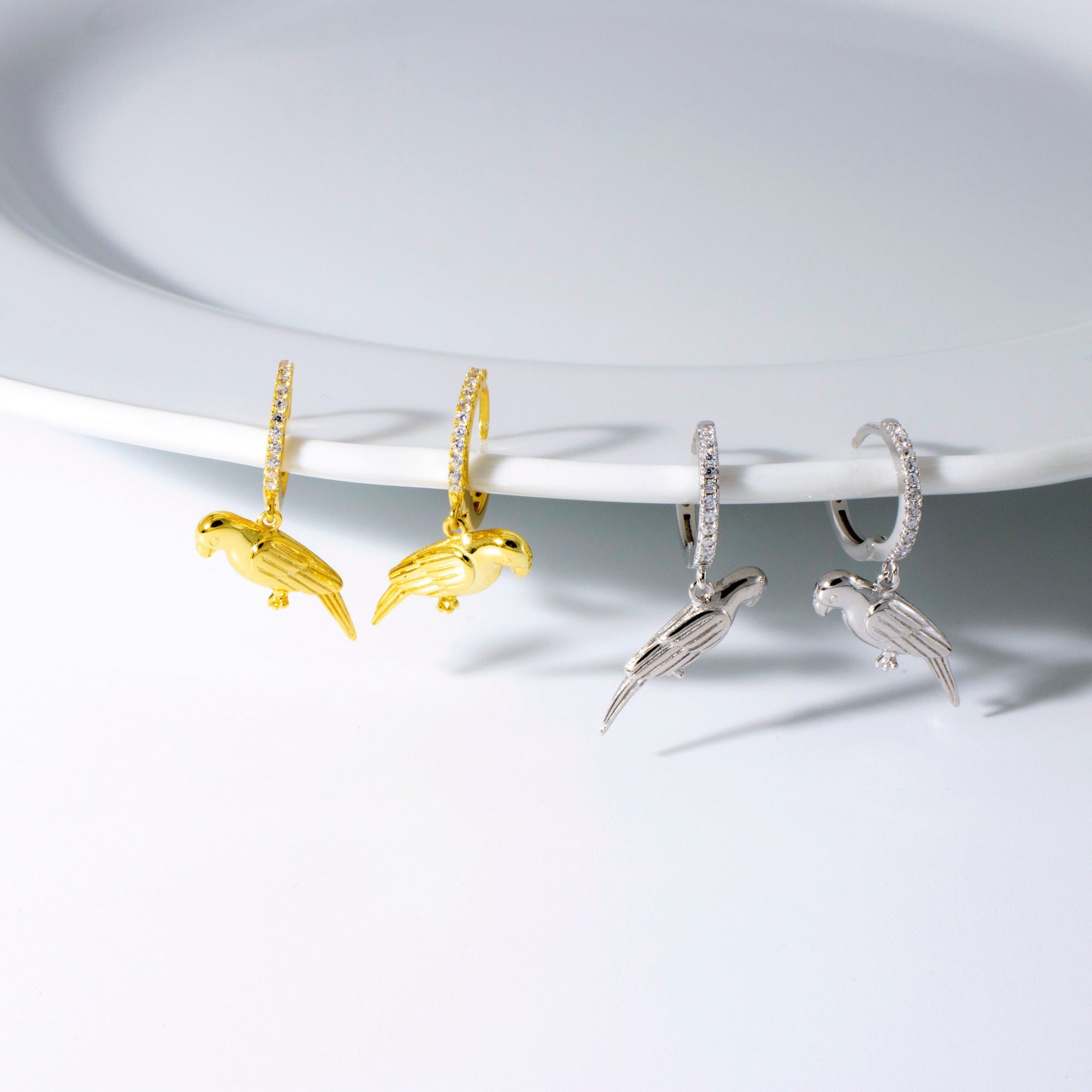Erleben Sie die überwältigende Pracht und Kraft dieses Ohrschmucks! Diese wundervollen Creolen sind mit schimmernden Zirkon-Steinen verziert. Der Anhänger benutzt eine niedliche Papagei-Figur, was für Leidenschaft und Entschlossenheit symbolisiert. Sie sind ein mächtiger Begleiter im Alltag.