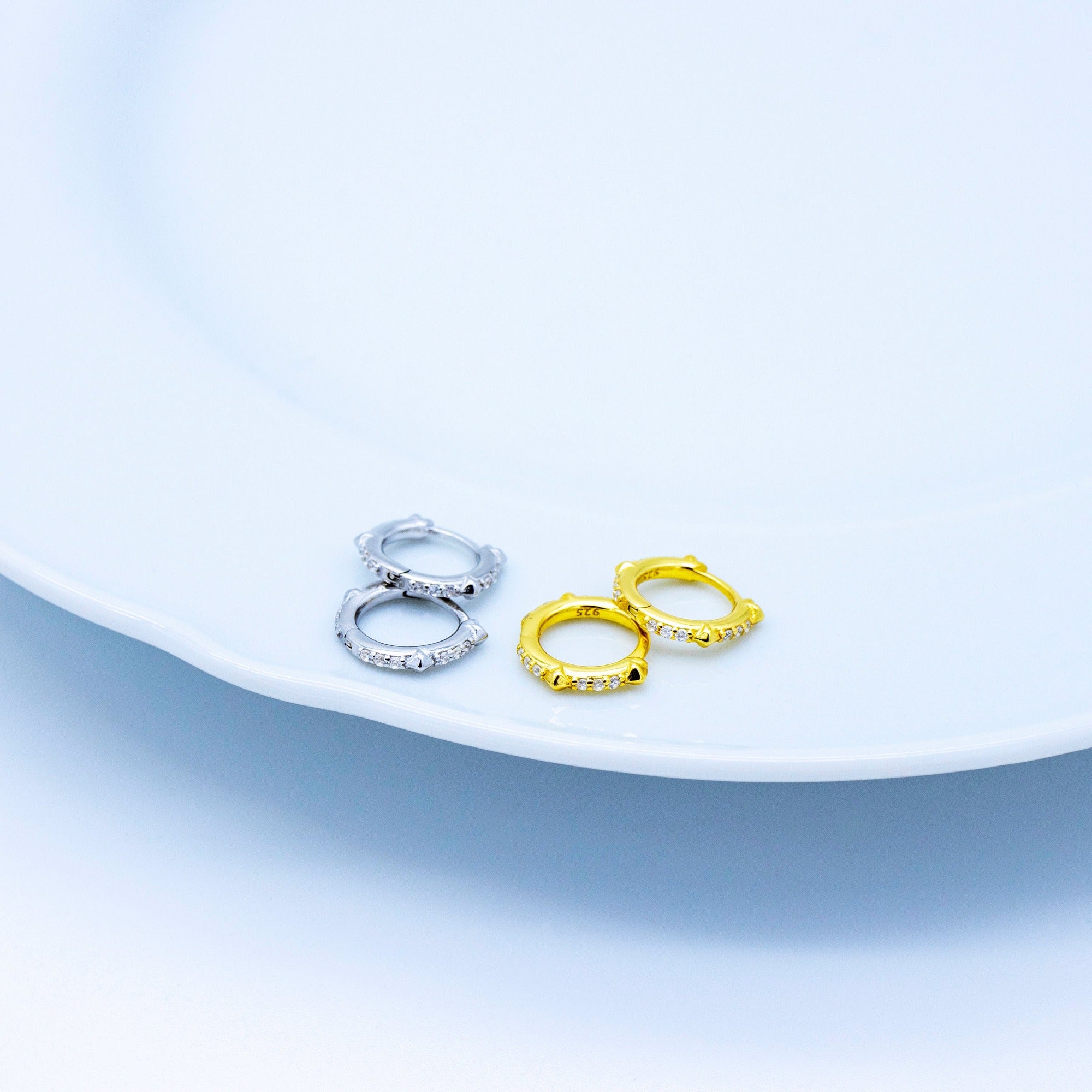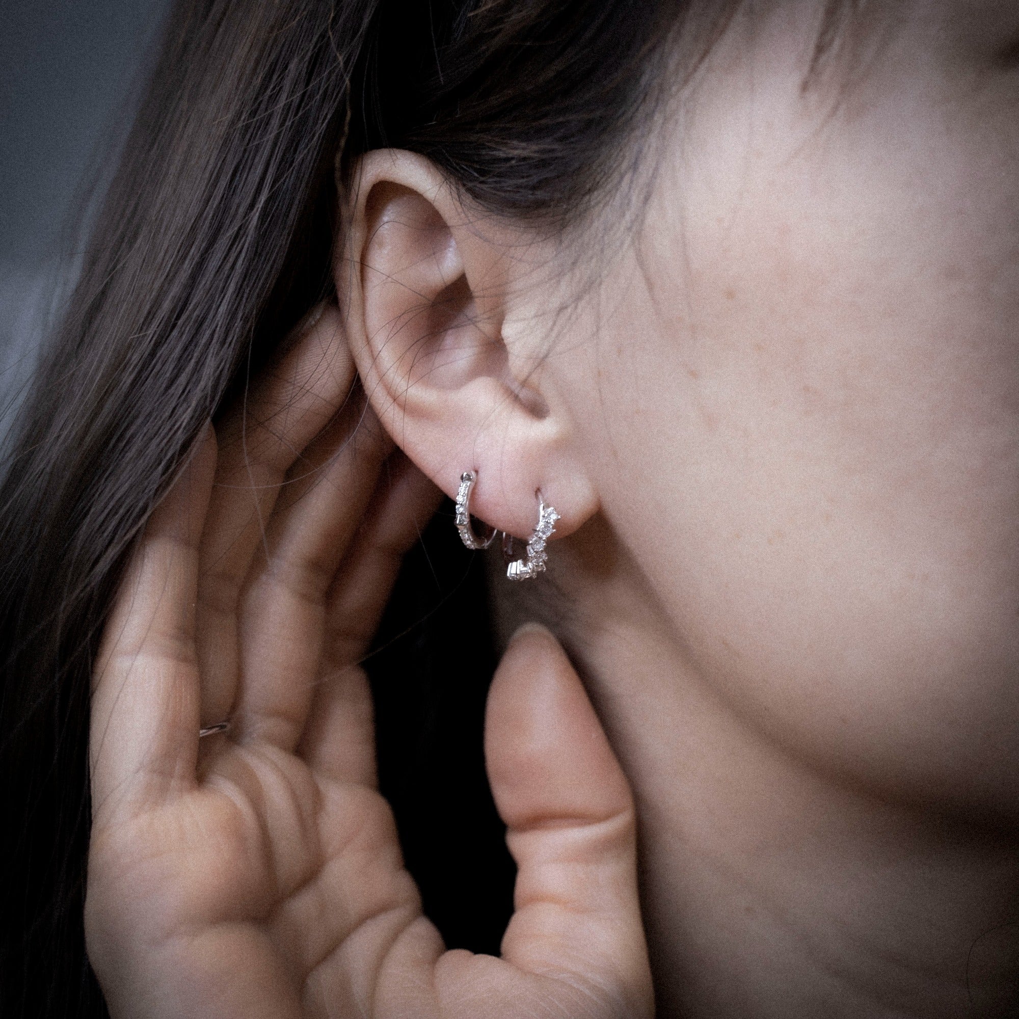 Entdecken Sie diese wunderschönen Creolen mit Spitzen in 925 Sterlingsilber. Zum einen sind sie dank der weißen Zirkonia-Steine ein funkelnder Hingucker. Zum anderen werden sie durch die industrielle Formensprache zu einem echten Eye-Catcher am Ohr. Wer es klassisch mag, bestellt sie und legt so einen eleganten Auftritt hin.