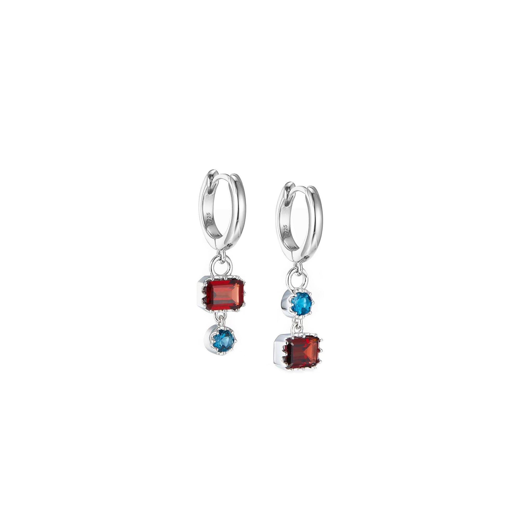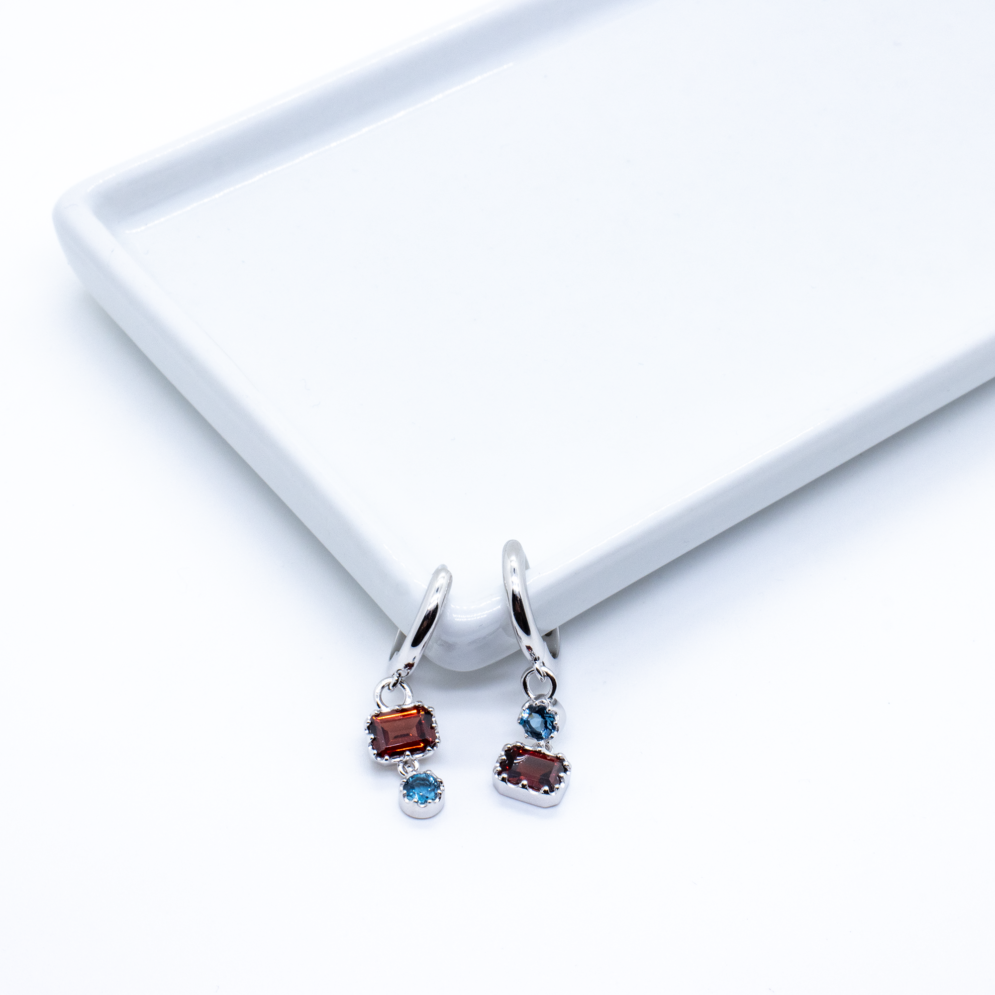 Diese Ohrringe vereinen zeitloses Design mit modernen Farben. Die silbernen Creolen bilden die Basis und tragen Ohrhänger, der mit einem runden blauen Topas und rechteckigen roten Granat versehen ist. Die Edelsteine sind in einer Krappenfassung gefasst, was ihnen einen modernen und schwebenden Effekt verleiht. Das Zusammenspiel der Farben und Formen verleiht den Ohrringen einen verspielten und dennoch eleganten Look.