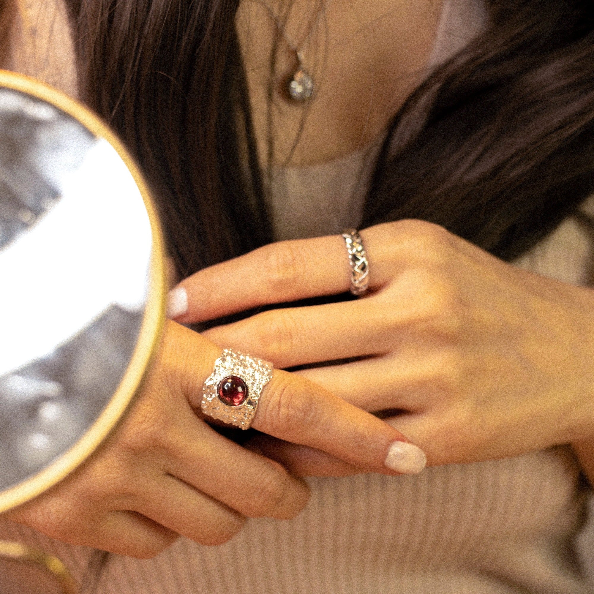 Dank seines schlichten, aber raffinierten Musters lässt sich der Ring vielseitig tragen. Ob als dezentes Einzelstück oder im Stacking mit anderen Ringen – er verleiht deinem Look einen modernen, femininen Touch. Besonders schön wirkt er in Kombination mit schlichten Goldketten oder Armreifen.