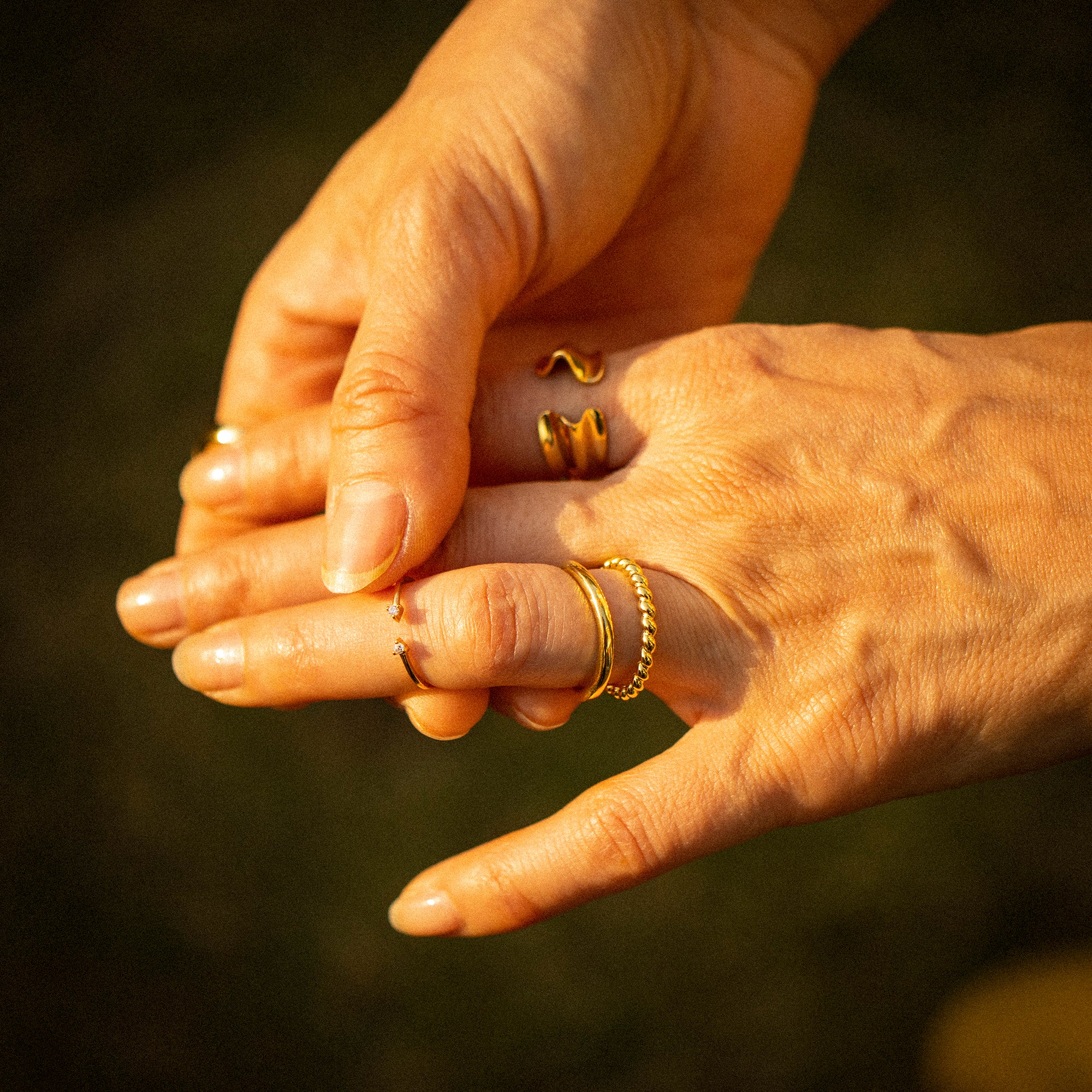 Dank des offenen, verstellbaren Designs passt sich der Yvette Ring deinem Finger optimal an. Trage ihn solo für einen dezenten, eleganten Look oder kombiniere ihn im Ring-Stacking mit schlichten Silber- oder Goldringen.